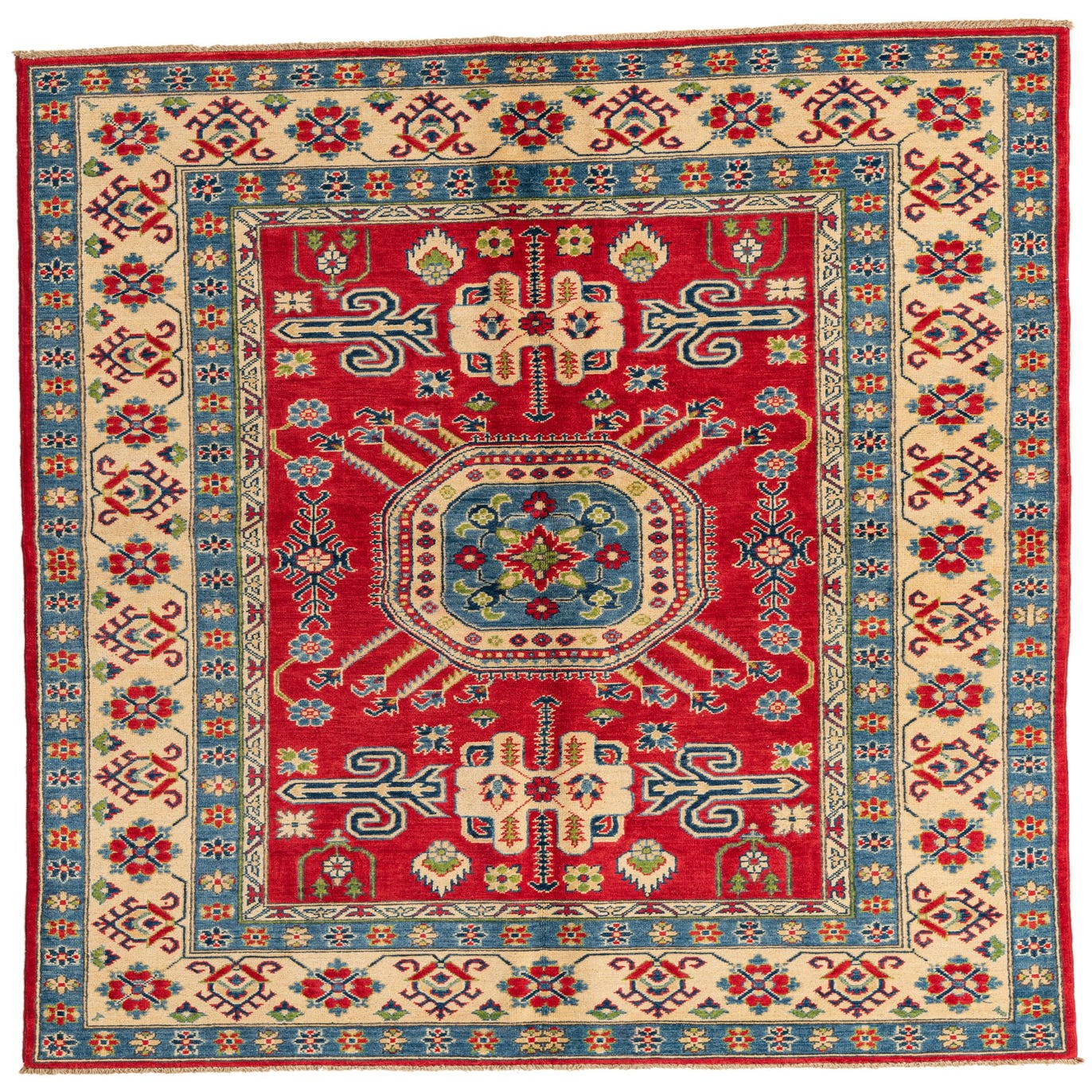 The Kazak collection offers a 6x9 hand-knotted rug crafted from 100% hand-spun wool, presenting a robust and textured surface. This particular piece boasts a rich red background, which serves as a dramatic canvas for the traditional patterns that decorate its surface. Accent colors include blue, brown, cream, navy blue, gold, and green, creating a harmonious blend that is both vibrant and sophisticated.