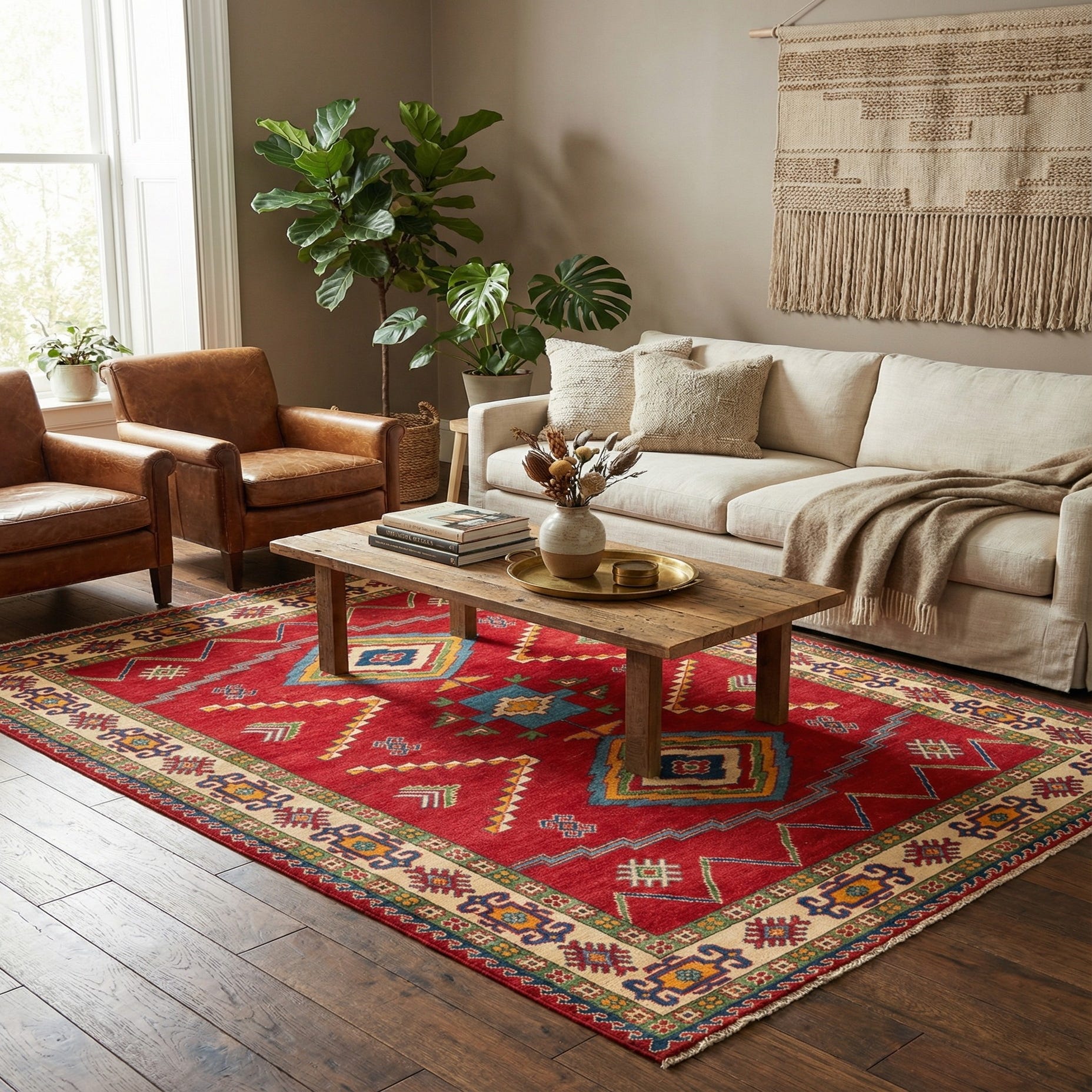 A 6x9 rectangular red Kazak rug with a Southwestern geometric pattern and a cream border, ideal for a living room.