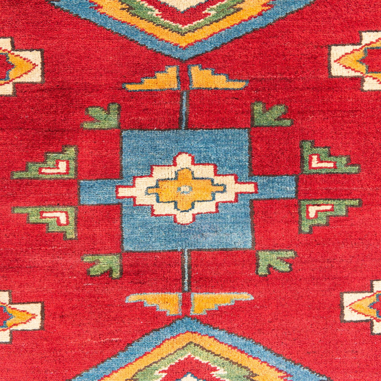 This Kazak collection rug features a bold, geometric pattern that draws inspiration from traditional tribal designs. A dense background in a robust red hue sets the stage for the detailed motifs that decorate the rug's field and border. Incorporated into the design are accent colors of beige, navy blue, yellow, green, and ivory, adding depth and complexity to the overall appearance. The hand-knotted construction from 100% hand-spun wool yields a texture that is both resilient and tactile underfoot, while the rug's fringe edges offer a classic finish to this 6x9 piece.