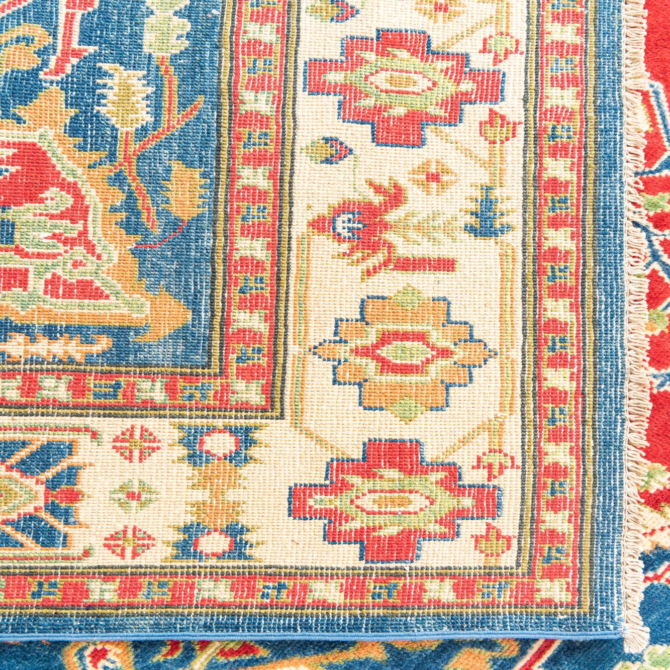 A 6x9 rectangular red and blue traditional Kazak wool rug with a central medallion and intricate border design.