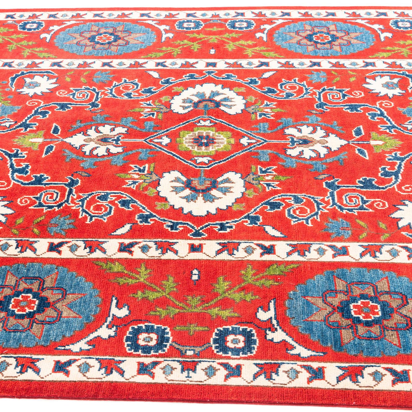 A 6x9 rectangular Rugs.com Kazak rug with a vibrant red field and intricate blue, green, and cream traditional patterns.