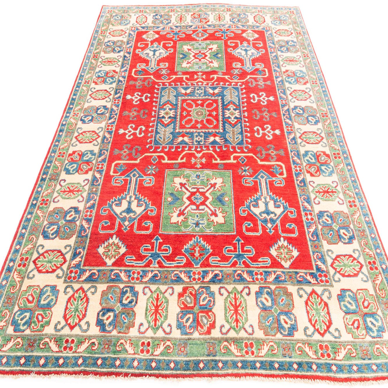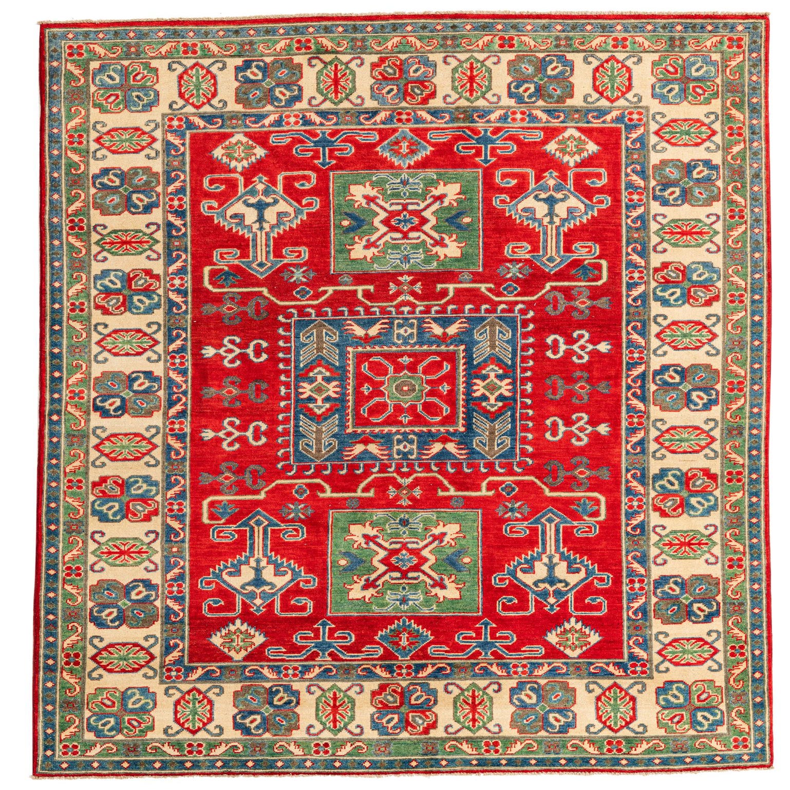 The Kazak Collection offers this 6x9 hand-knotted rug, crafted from 100% hand-spun wool. It showcases a rich red background complemented by a harmonious blend of colors, including blue, green, navy blue, cream, and brown. The enduring Kazak pattern features a series of geometric motifs and stylized floral elements that create a captivating and symmetrical design, lending a bold and traditional feel to this piece.