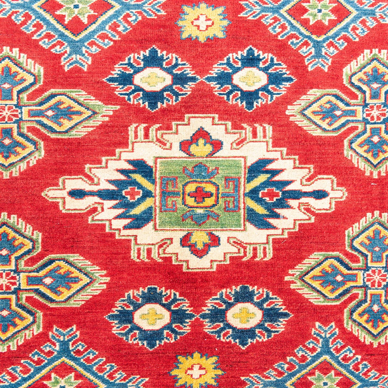 This Kazak collection rug is a 6x9 hand-knotted piece, crafted meticulously from 100% hand-spun wool for a textured feel that conveys traditional craftsmanship. Its rich red background is adorned with a symmetrical pattern featuring a mix of geometric shapes and traditional motifs. The color palette includes vibrant hues of blue, brown, cream, navy blue, yellow, and green, adding depth and diversity to the intricate designs. Each corner of the central field is anchored by bold, angular elements, while the main border frames the rug with a complementary series of stylized patterns.