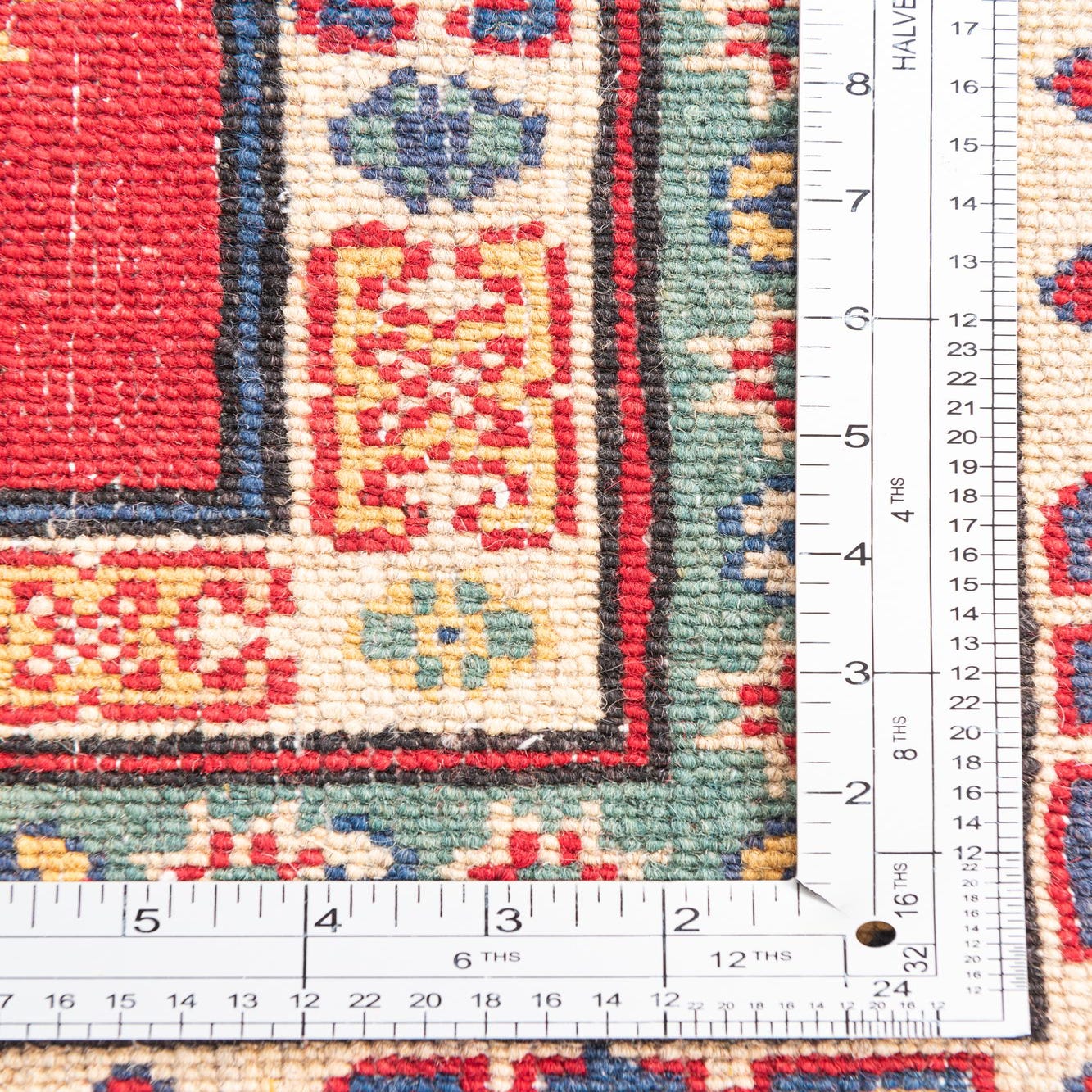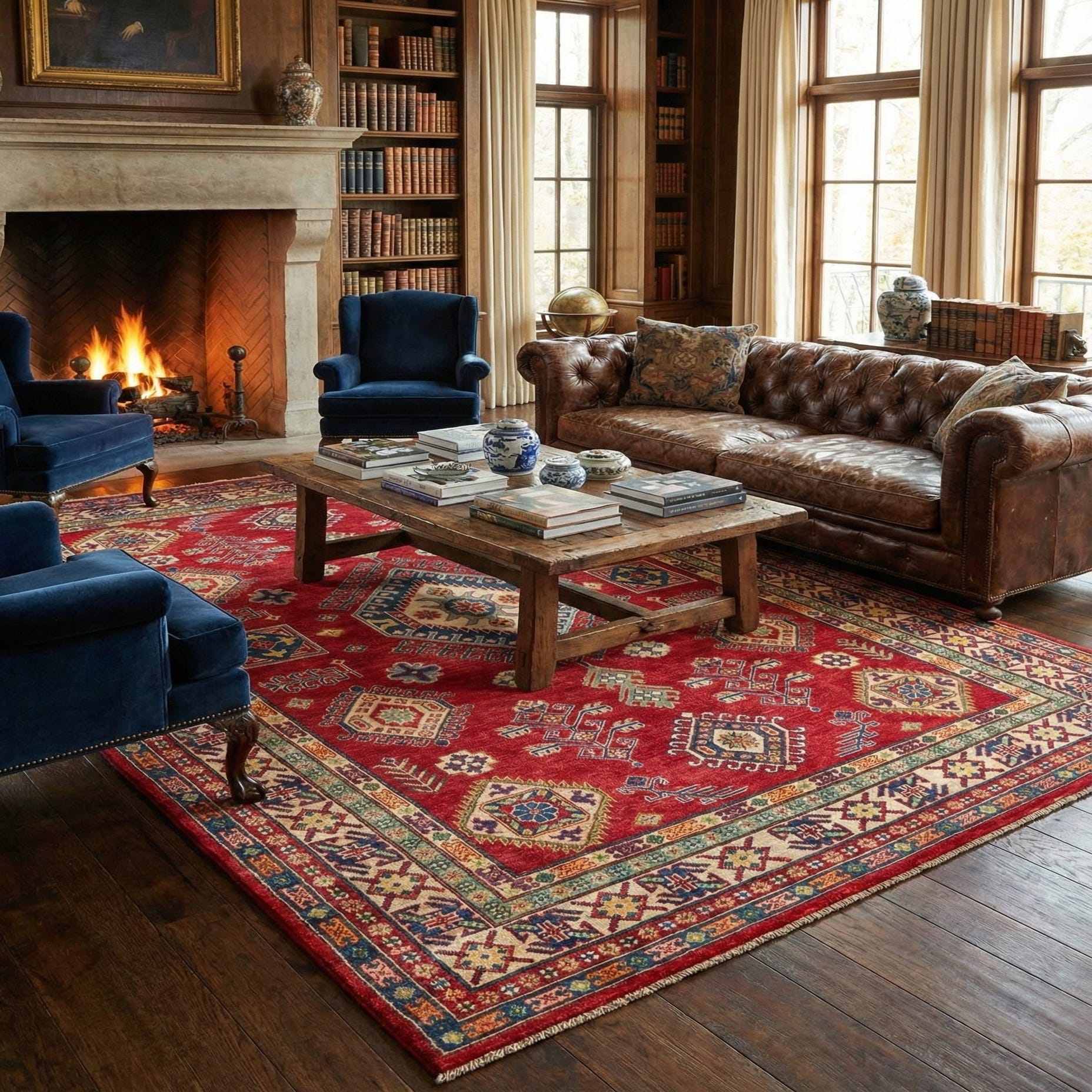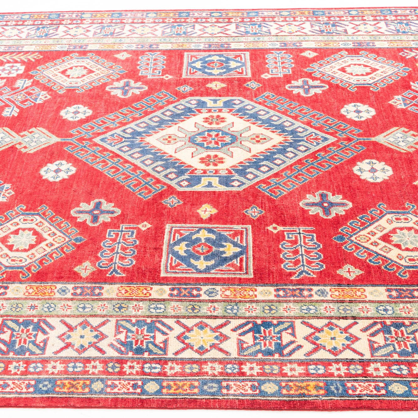 A 6x9 rectangular red Kazak rug with intricate traditional Southwestern and Oriental patterns in blue, yellow, and cream.