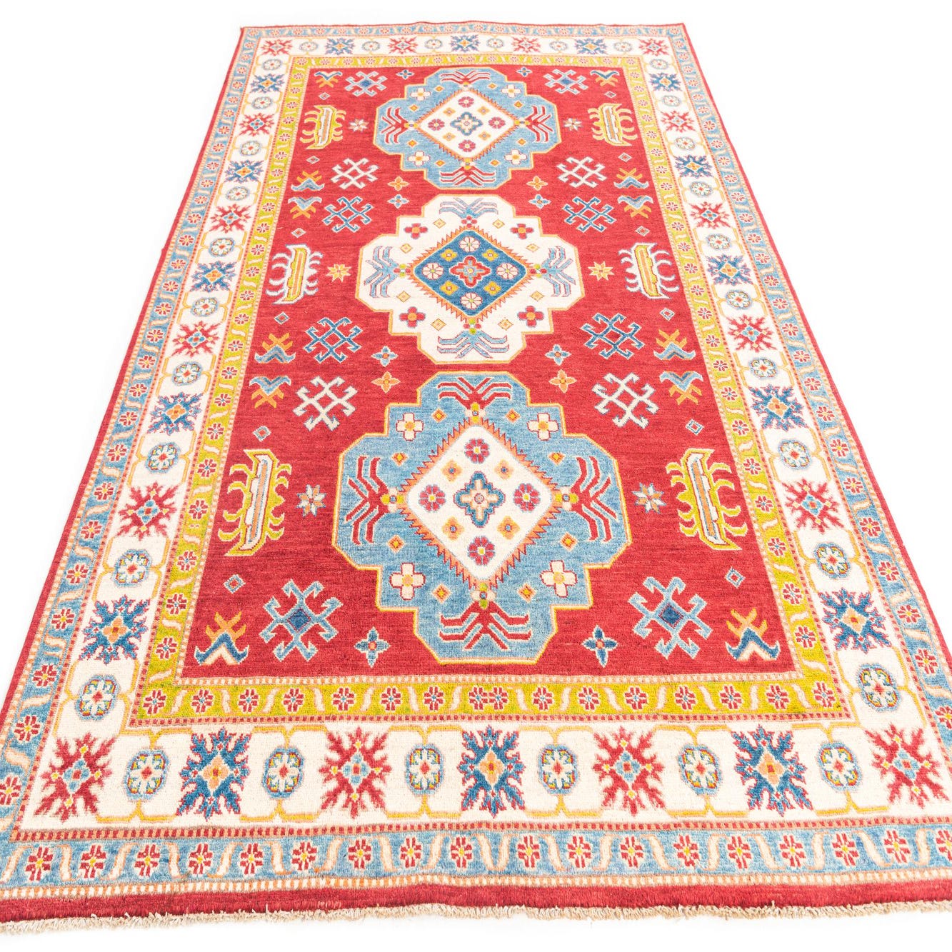 A 6x9 rectangular red Kazak rug with a traditional medallion pattern in blue, cream, and green.