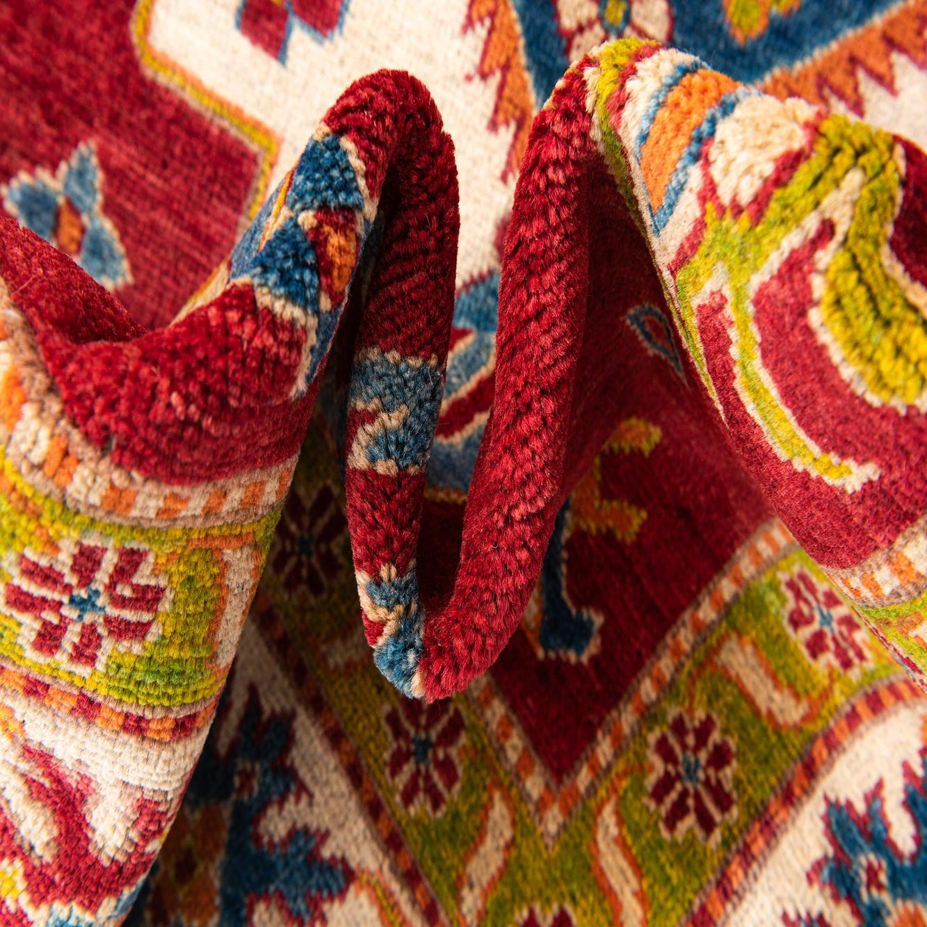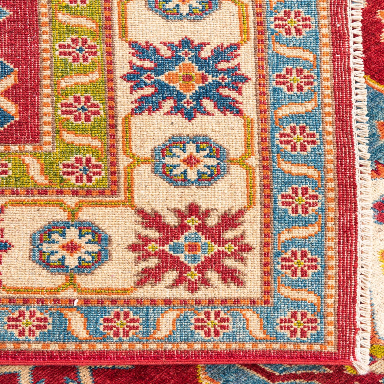 This Kazak collection rug is hand-knotted with 100% hand-spun wool, offering a substantial and durable texture that will add longevity and character to any space. The 6x9 piece boasts a vibrant red background complemented by an array of colors including beige, blue, brown, green, ivory, and orange, creating a dynamic and rich color palette.