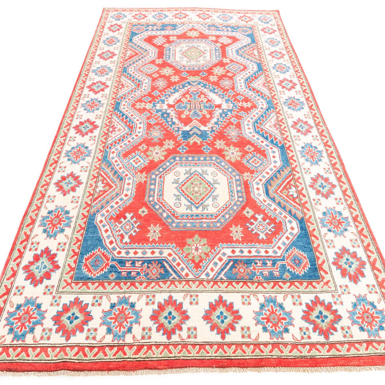 A 6x9 rectangular red Kazak rug featuring a traditional Southwestern medallion pattern in blue, cream, and green.