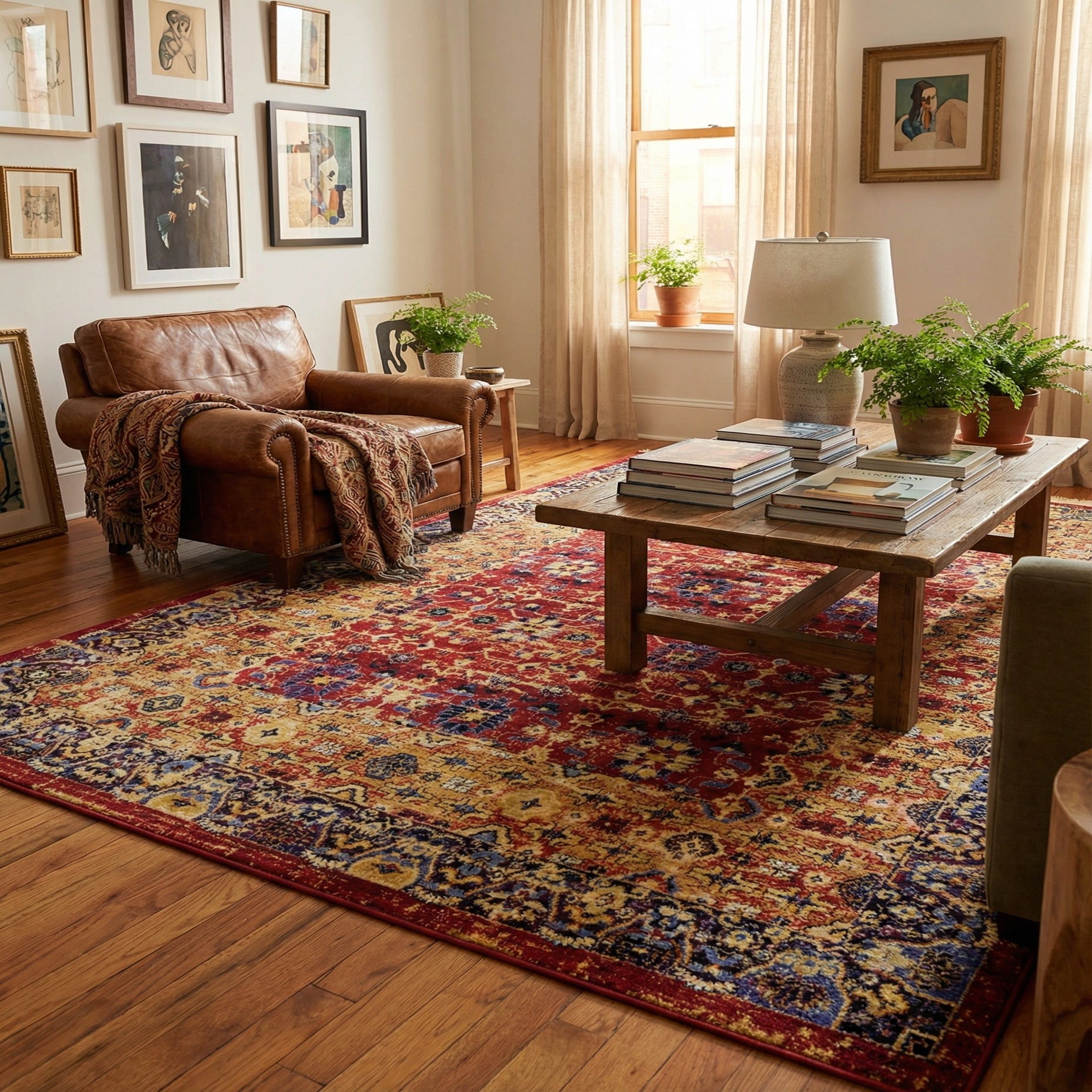 Machine-made from 100% polypropylene, the rug has a low-profile, softly textured pile that feels smooth underfoot while maintaining crisp pattern definition. It pairs naturally with warm wood furniture and leather seating for a classic living room or library, and also brings color and structure to a neutral, contemporary space. Use it to anchor a seating area, define a dining arrangement, or add pattern to an entryway; it layers well with ivory, navy or gold textiles and complements both traditional and transitional decor schemes.