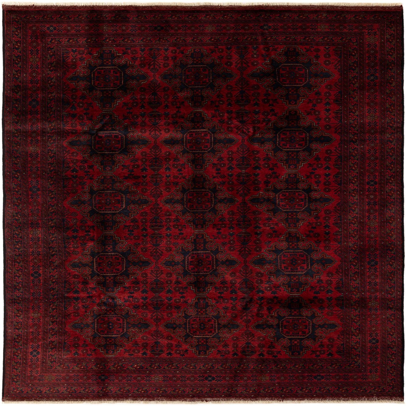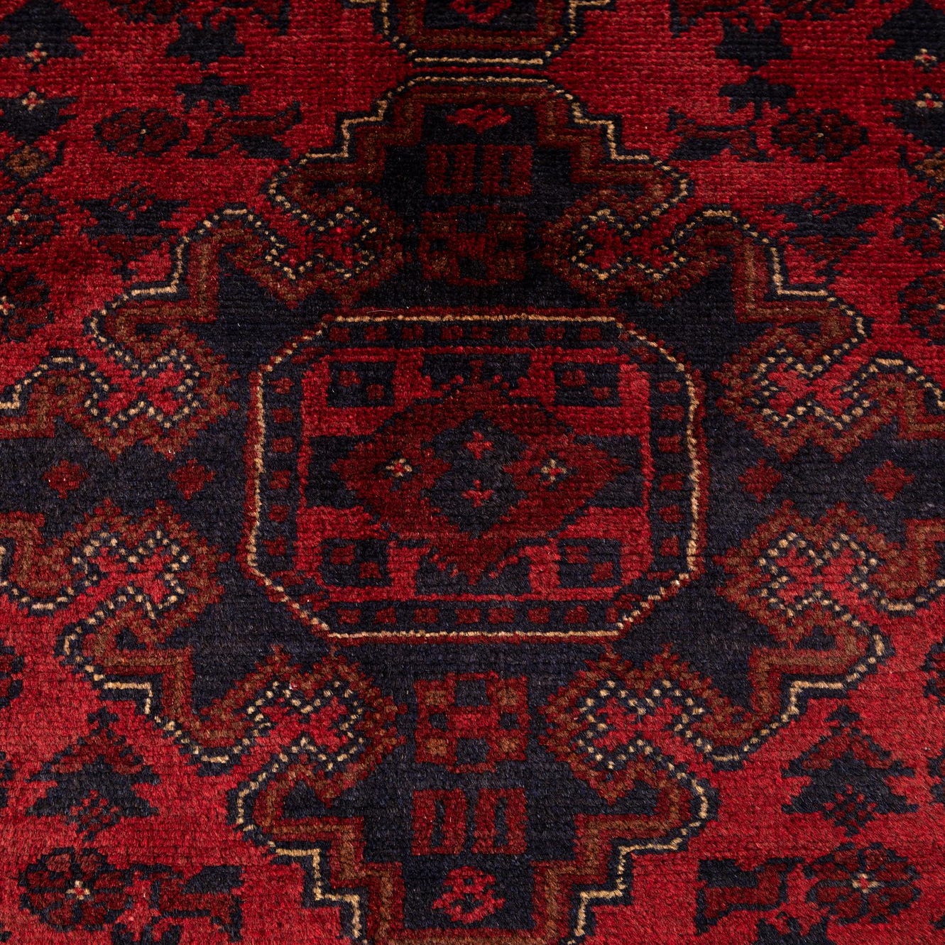 A 6x9 rectangular Khal Mohammadi rug in deep red with a repeating dark geometric pattern, suitable for a living room.