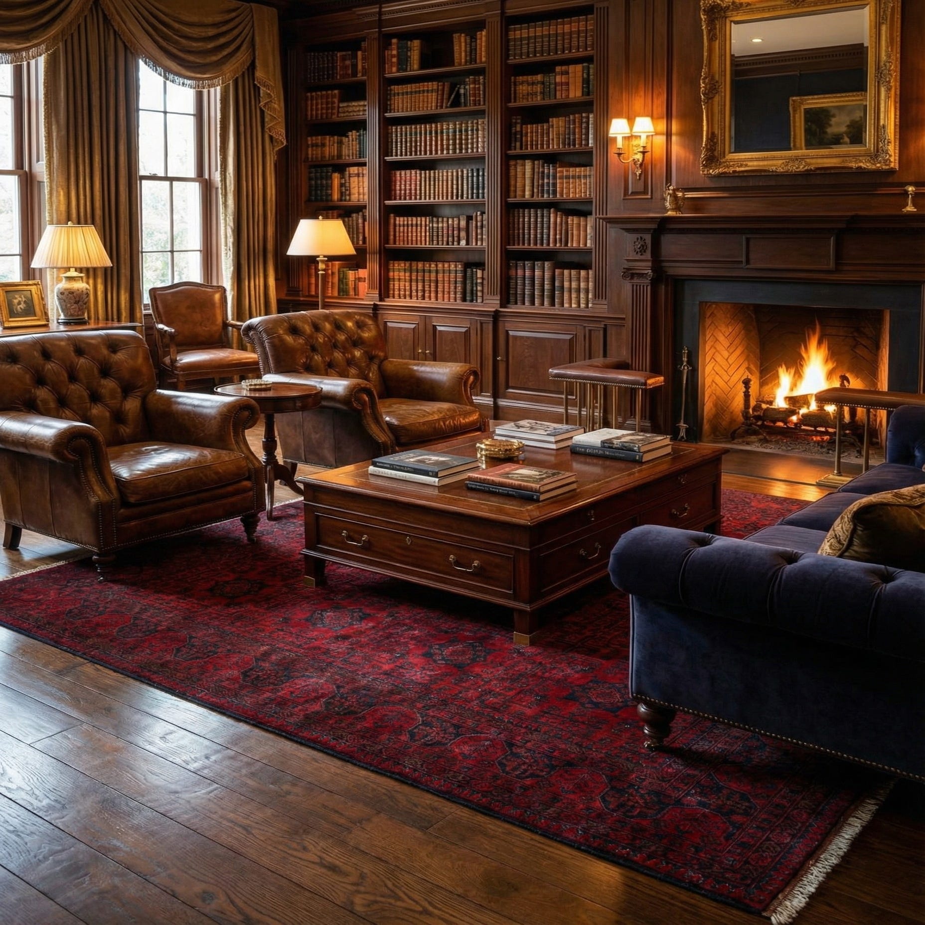 Primary color is Red. Colors in this rug include: Red, Brown, Navy Blue.