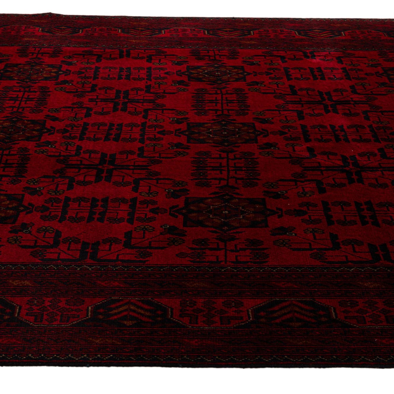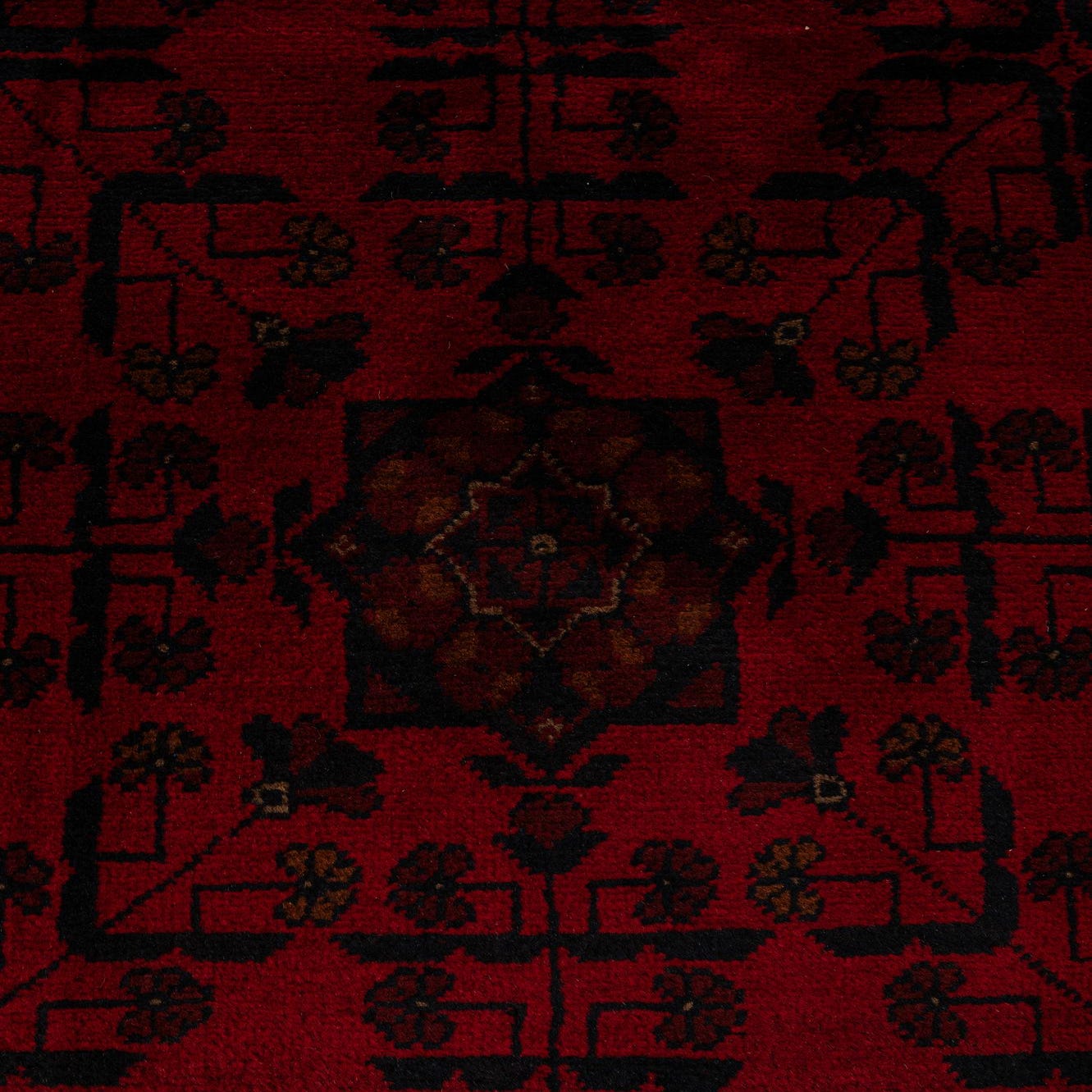 A 6x9 rectangular Khal Mohammadi rug in deep reds with a repeating dark geometric and floral oriental pattern.
