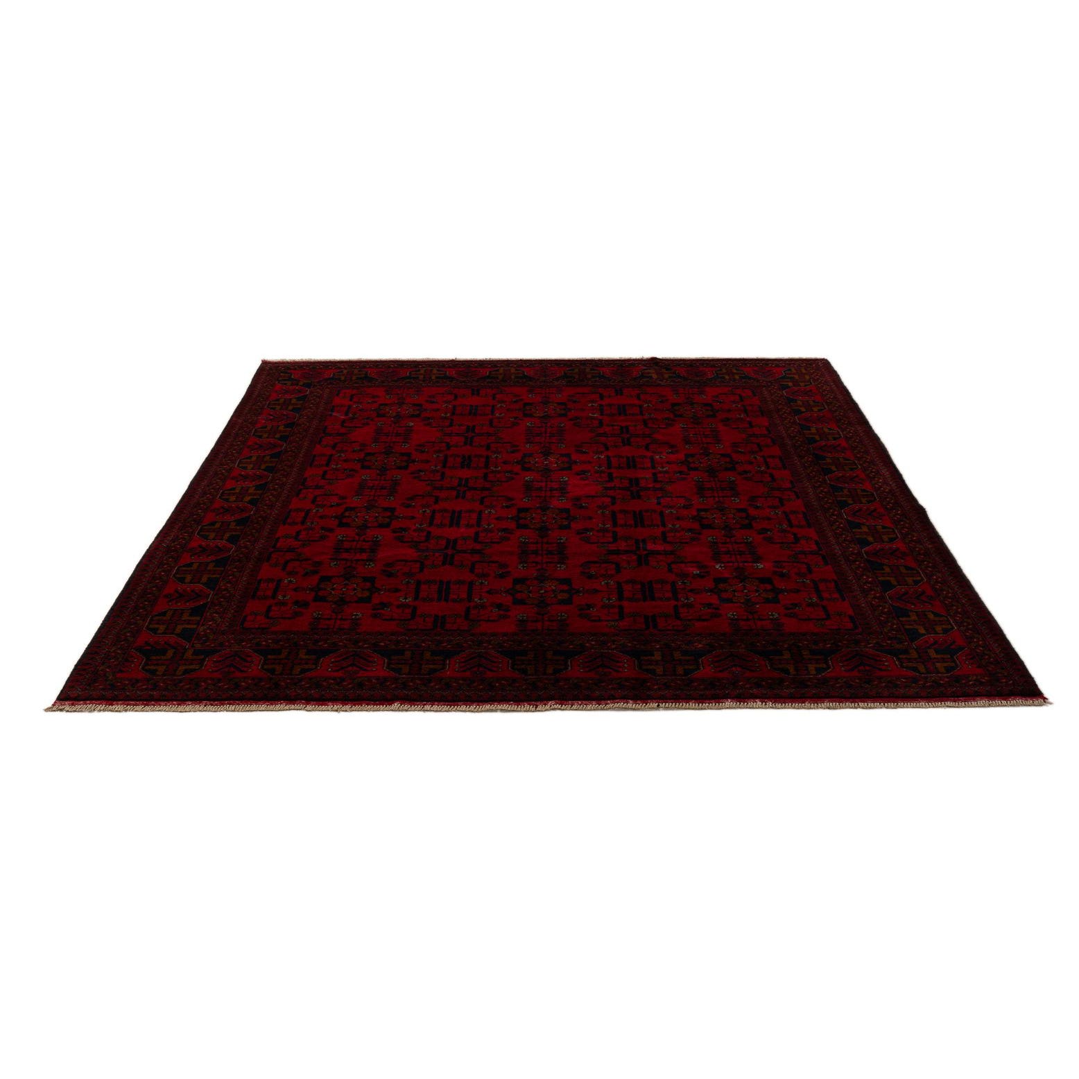 A 6x9 rectangular Khal Mohammadi rug in deep red with intricate dark blue and black oriental patterns, suitable for a living room.