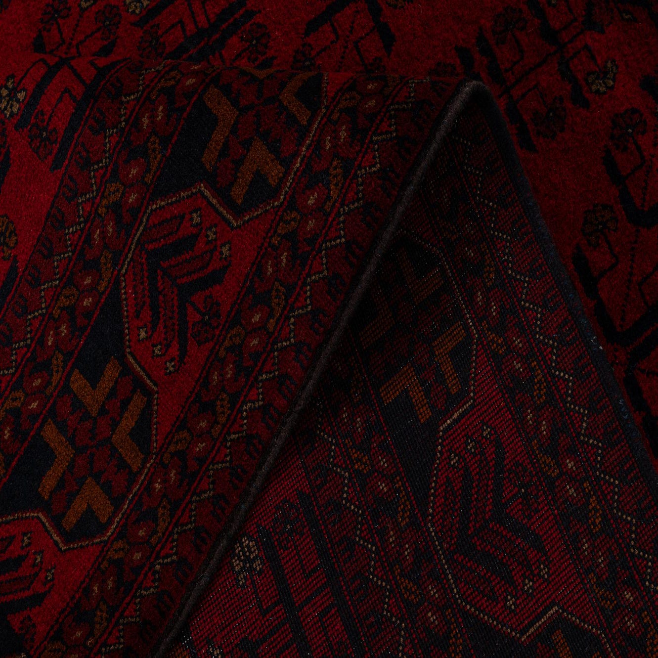 Primary color is Red. Colors in this rug include: Red, Black, Brown.