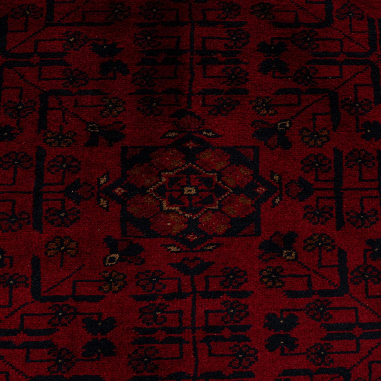 A 6x9 rectangular Khal Mohammadi rug in deep red with intricate black and dark red oriental patterns and a thin pile, ideal for a living room.