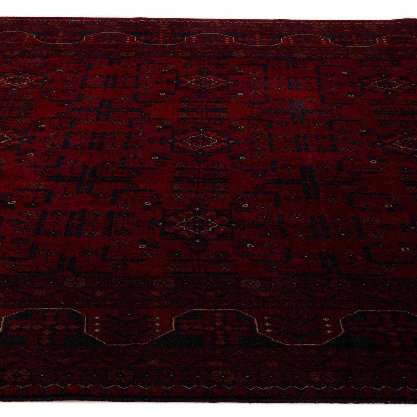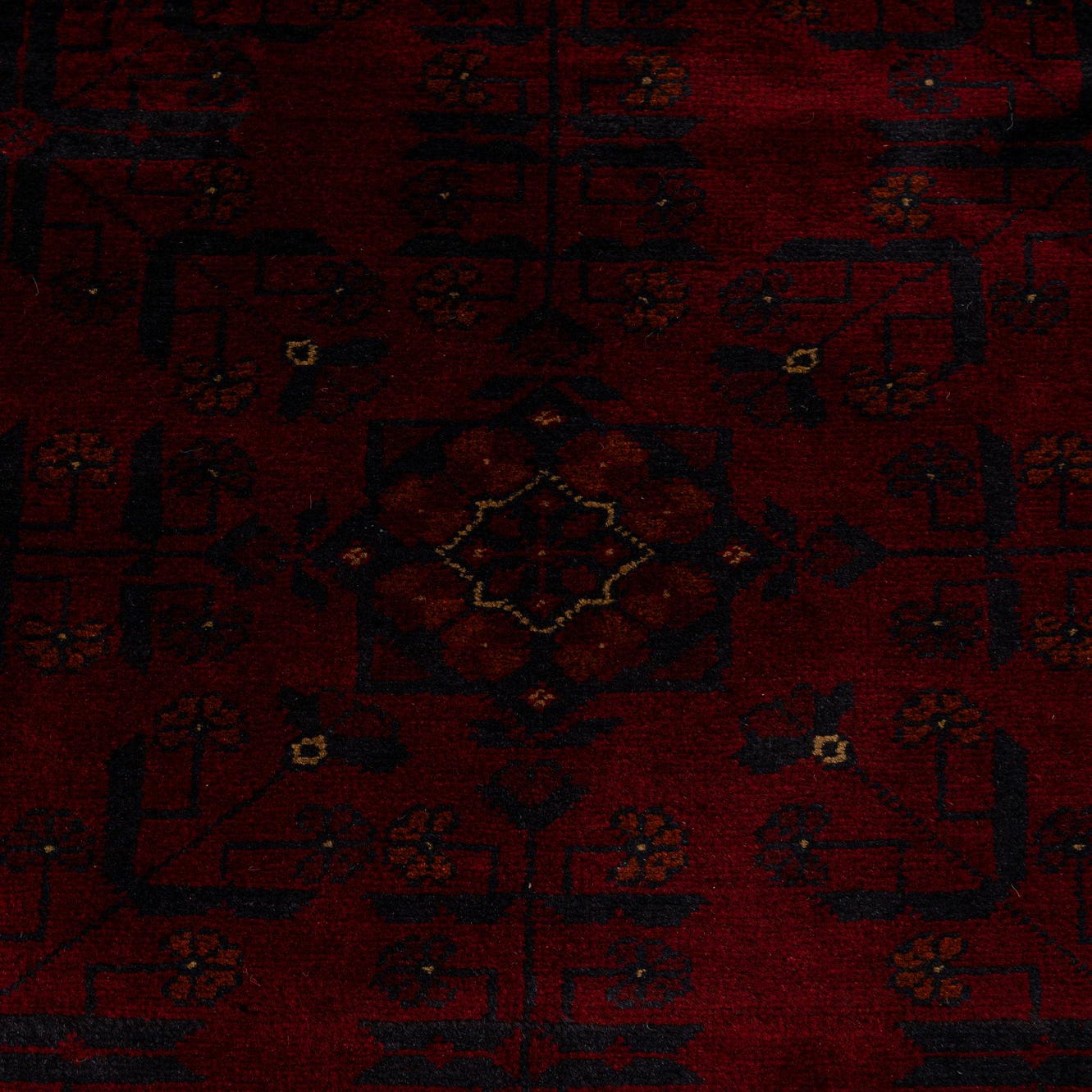 A classic, hand-knotted wool rug with a deep red ground patterned in repeating geometric guls and small medallions in black and brown. The design is bordered by a stepped motif that frames the field, giving the piece a measured, structured look. Woven from 100% wool, the pile is dense and low—soft to the touch yet firm underfoot—with the natural wool texture providing subtle depth and a warm, matte luster.