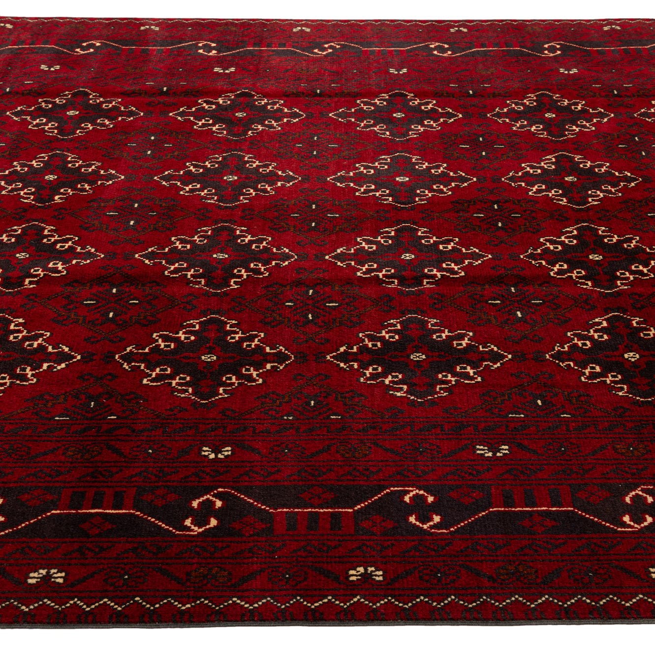 A 6x9 rectangular Rugs.com Khal Mohammadi rug featuring a deep red field with repeating black and gold modern patterns and a matching border.