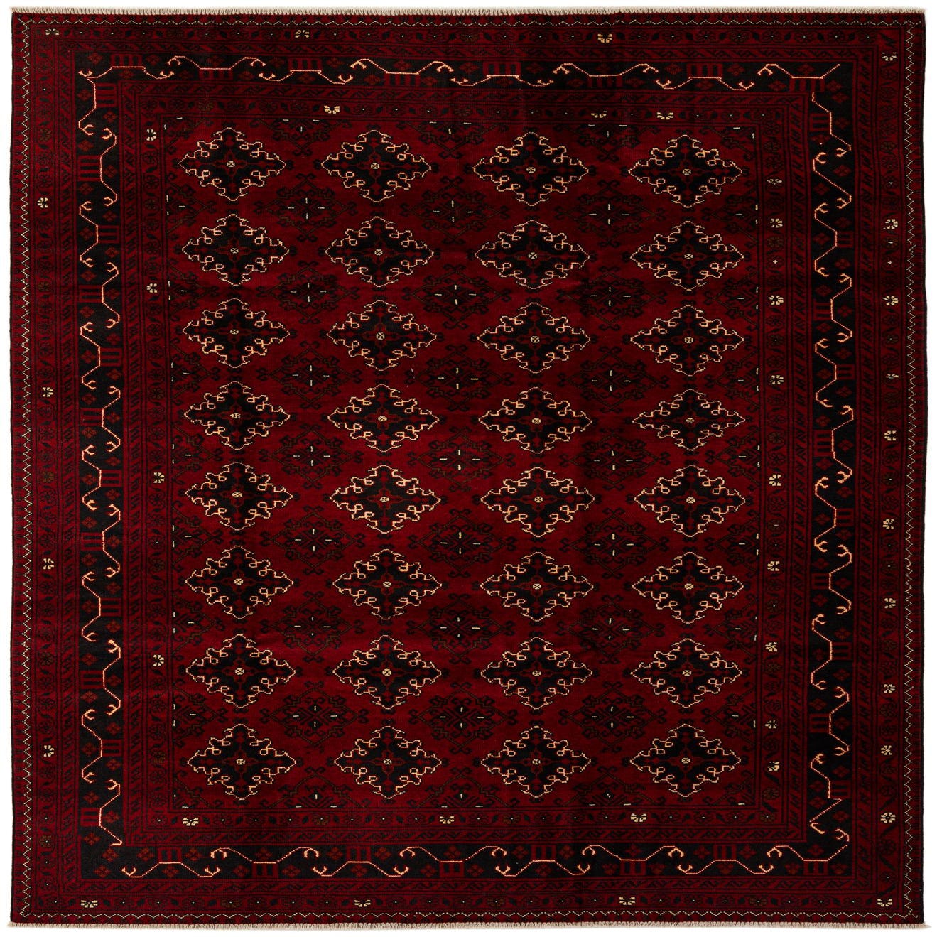 A 6x9 rectangular red Khal Mohammadi wool rug with a modern geometric pattern and dark border.