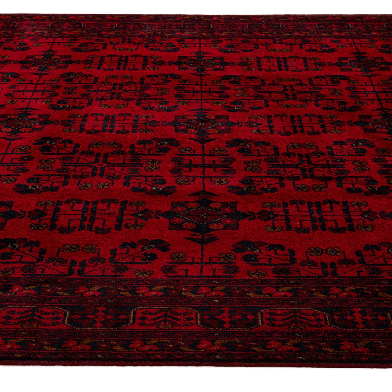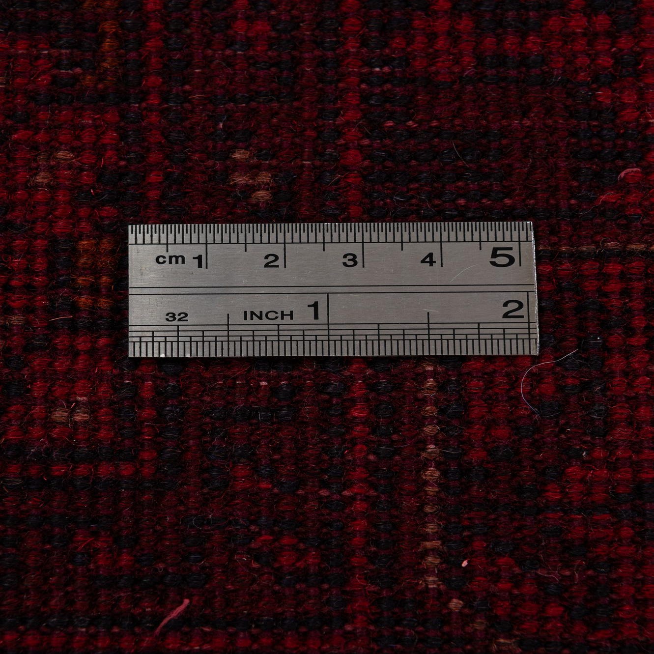 A 6x9 rectangular Khal Mohammadi rug in deep red with a repeating black modern geometric pattern and a dark border.