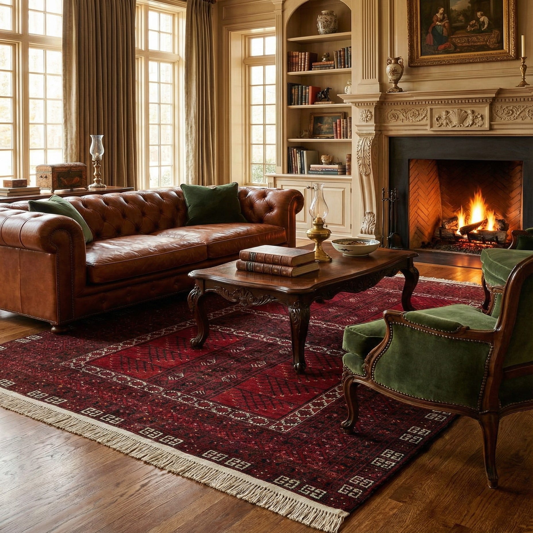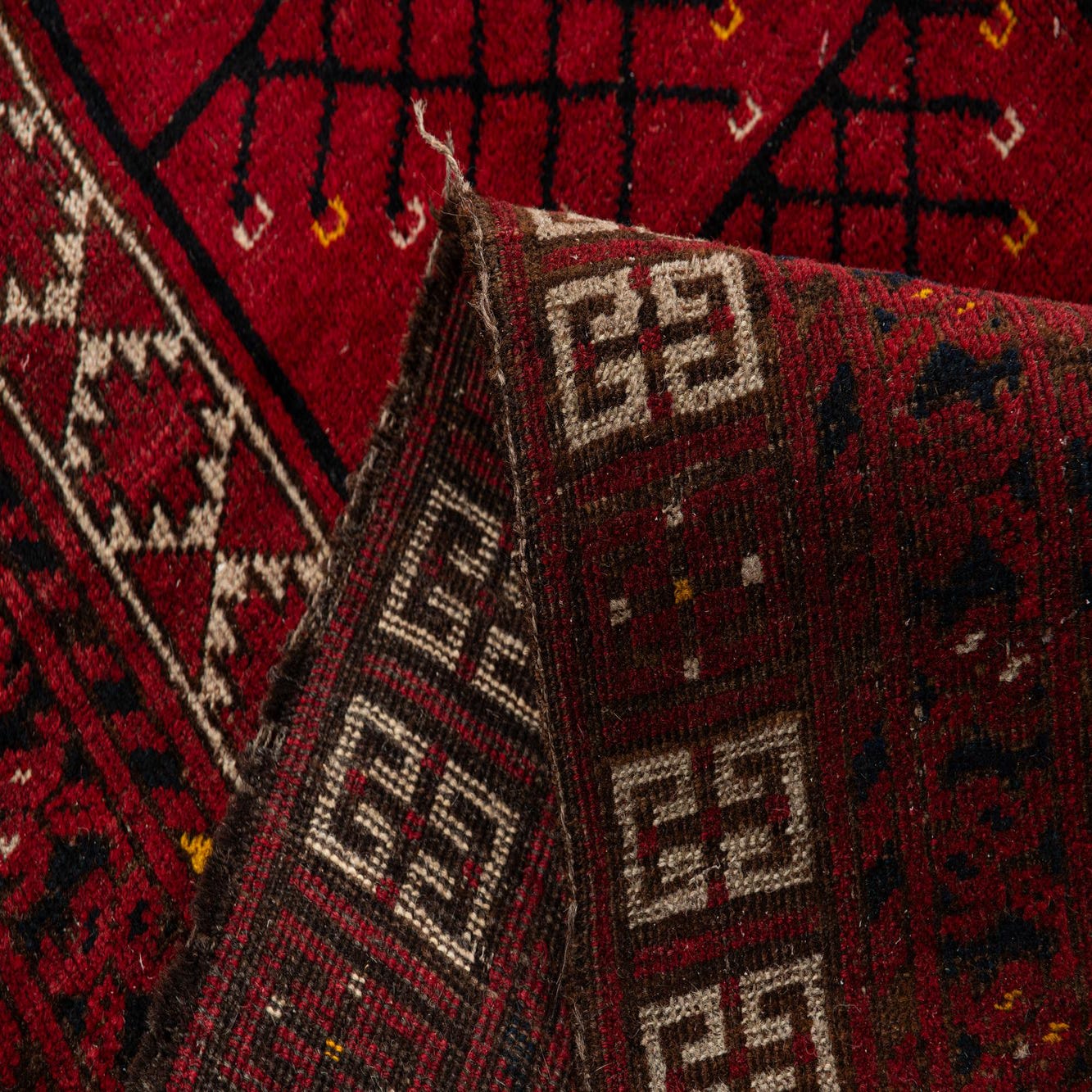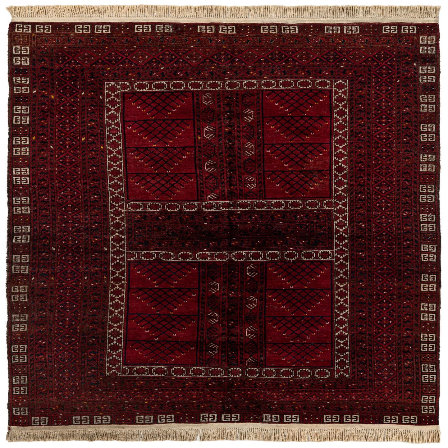A 6x9 rectangular Khal Mohammadi wool rug in deep reds with a central geometric pattern and intricate border.