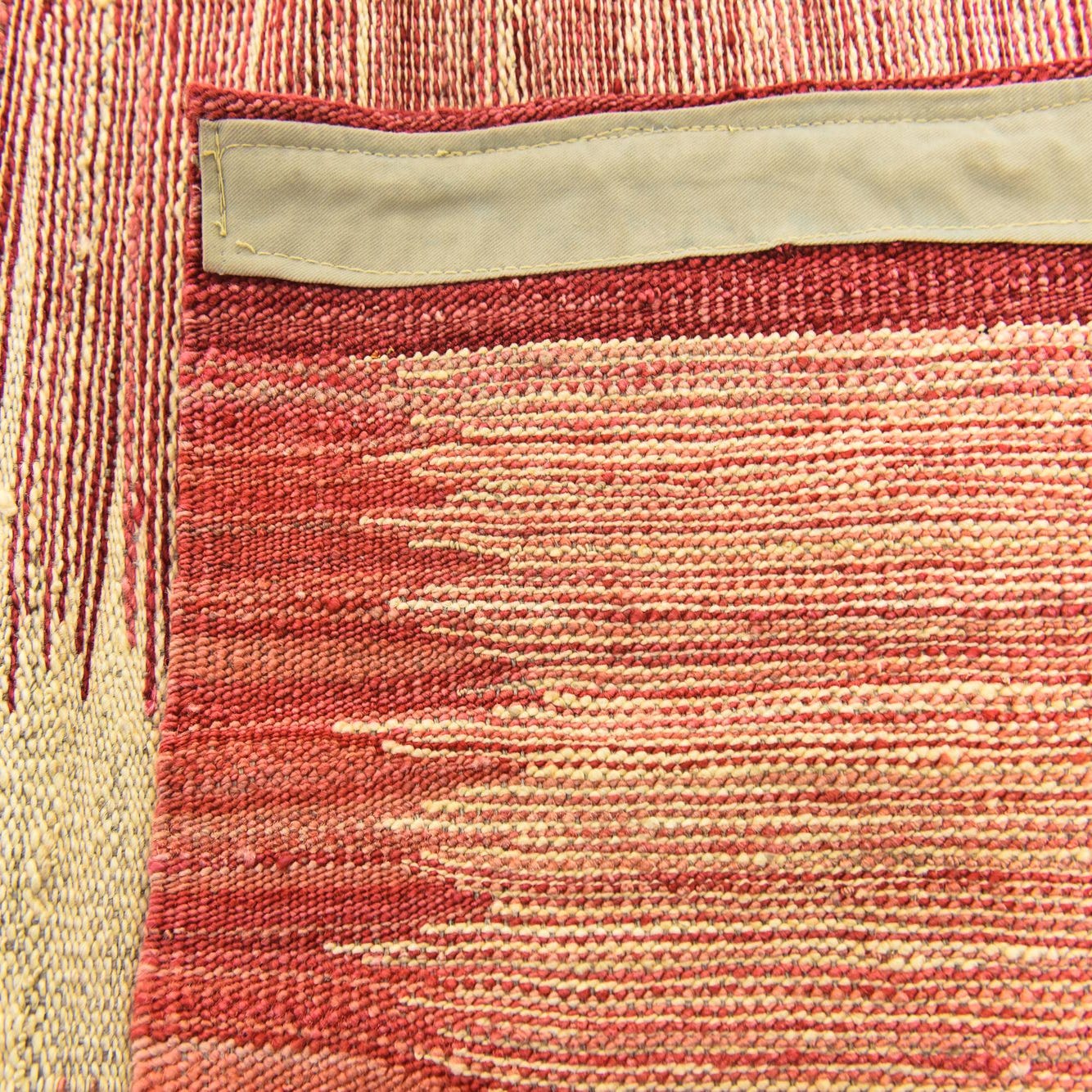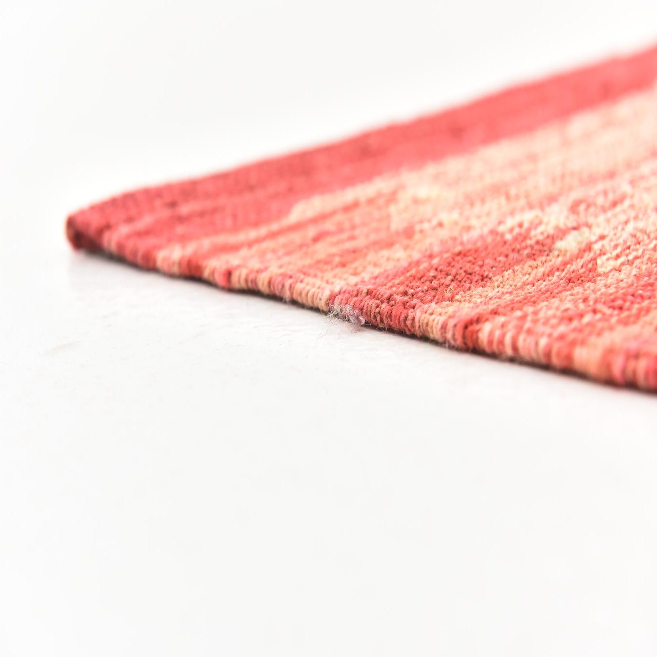 The rug's striking visual impact and flat-weave make it suitable for a variety of interior design scenarios. Its minimalist design allows it to blend seamlessly with modern and Scandinavian aesthetics, while the rich red hue can serve as an anchor for eclectic or bohemian-inspired spaces. The piece would also complement a mid-century modern setting, providing a pop of color and a touch of artisanal craftsmanship.