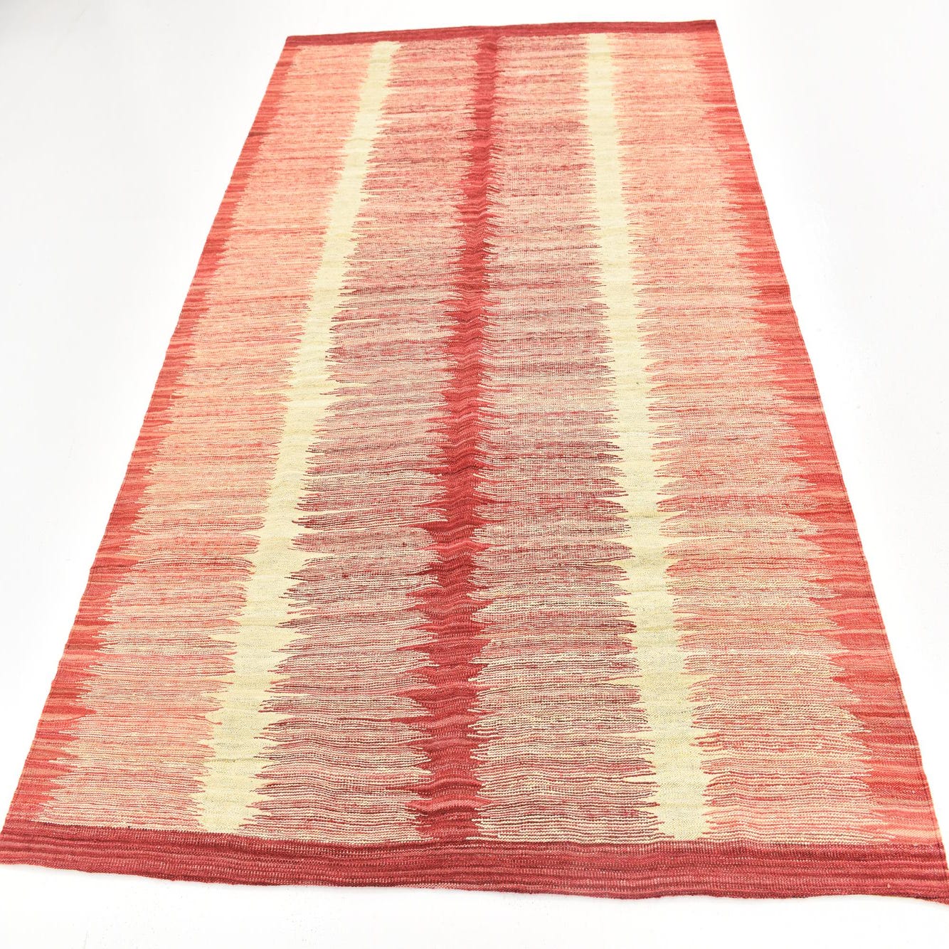 A 6x9 rectangular Kilim Modern rug with a flatweave texture, featuring abstract red and off-white vertical stripes.