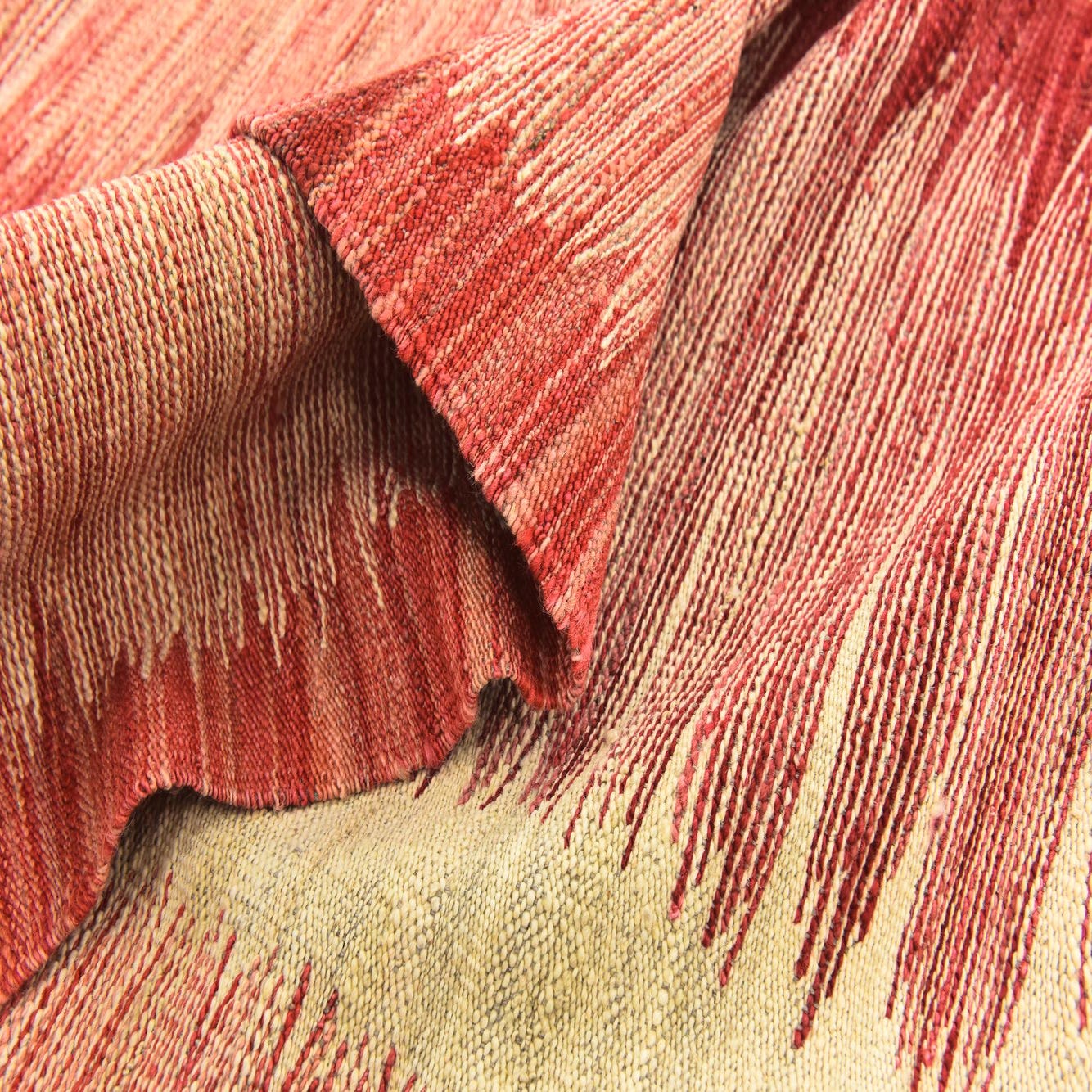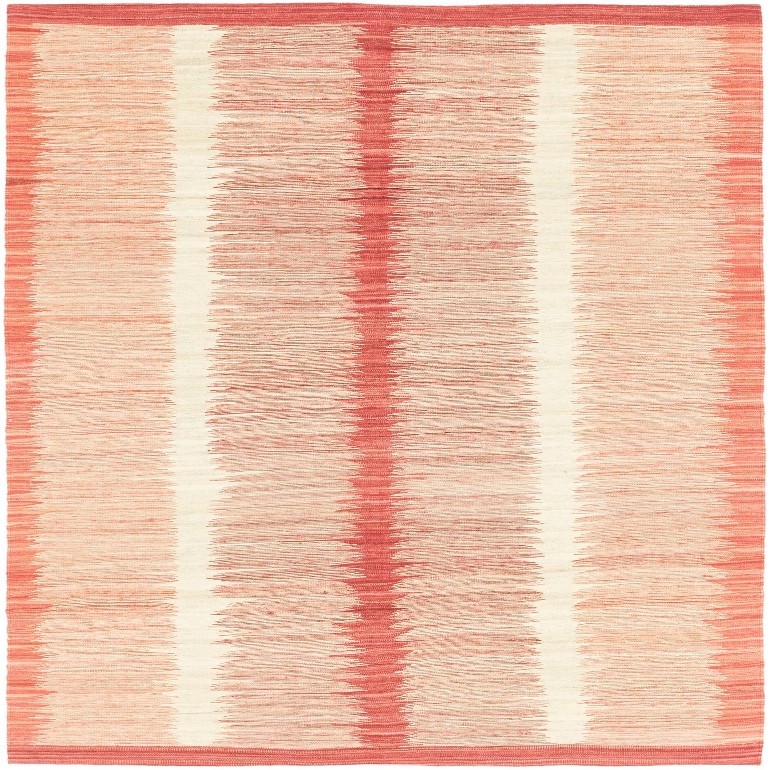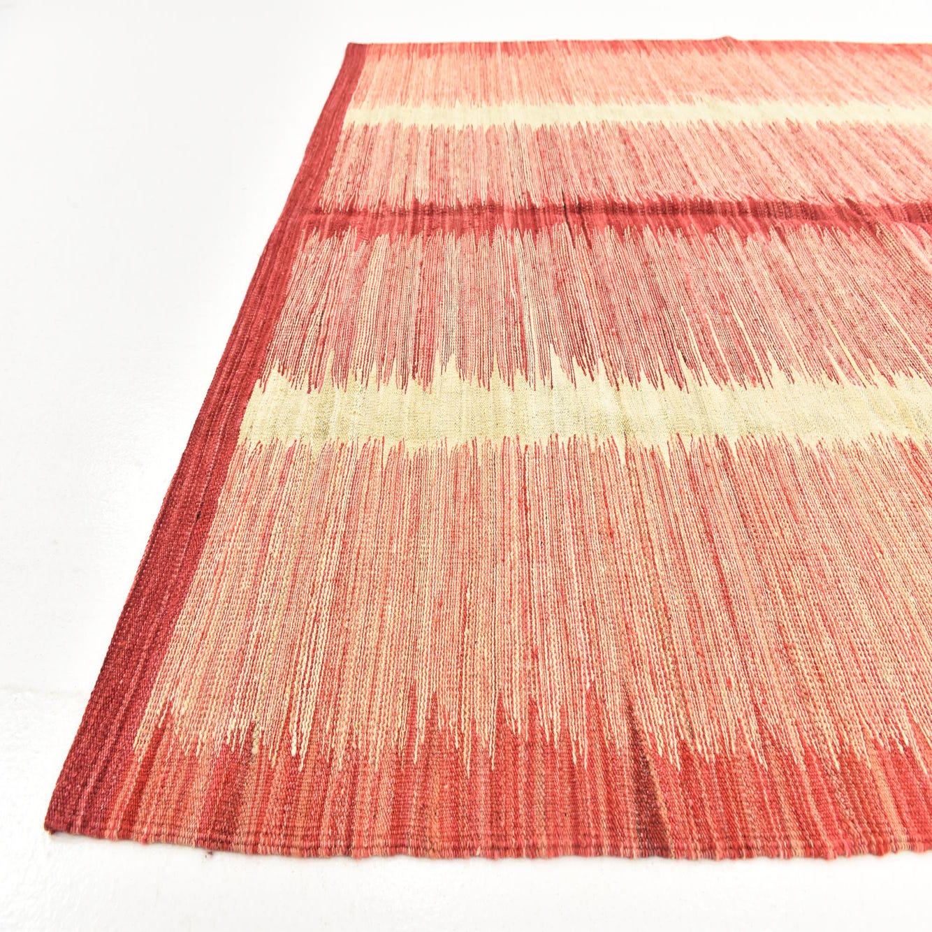 This Kilim Modern collection rug presents a bold and vibrant composition, featuring a dominant red background paired with cream and peach stripes, creating a captivating contrast. The pattern showcases a contemporary take on traditional kilim designs, characterized by its linear simplicity and symmetry. Measuring 6x9, the hand-woven construction from 100% wool offers a distinct texture that is both durable and tactile underfoot.