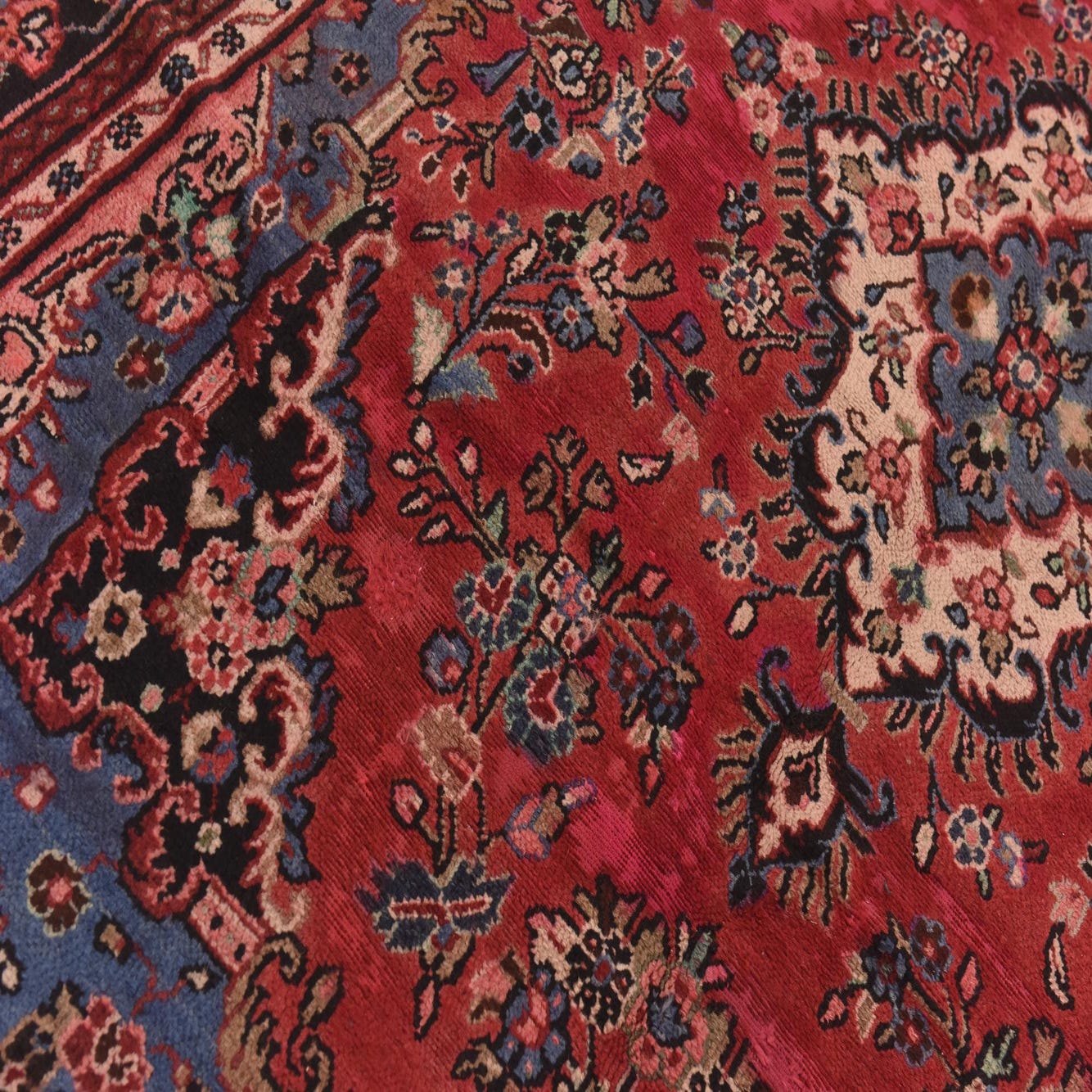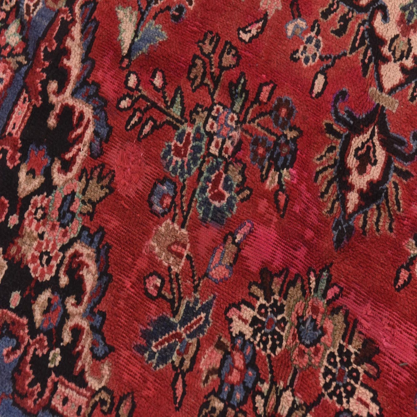 Primary color is Red. Colors in this rug include: Red, Beige, Black, Blue, Green, Ivory, Navy Blue, Olive, Peach, Salmon.