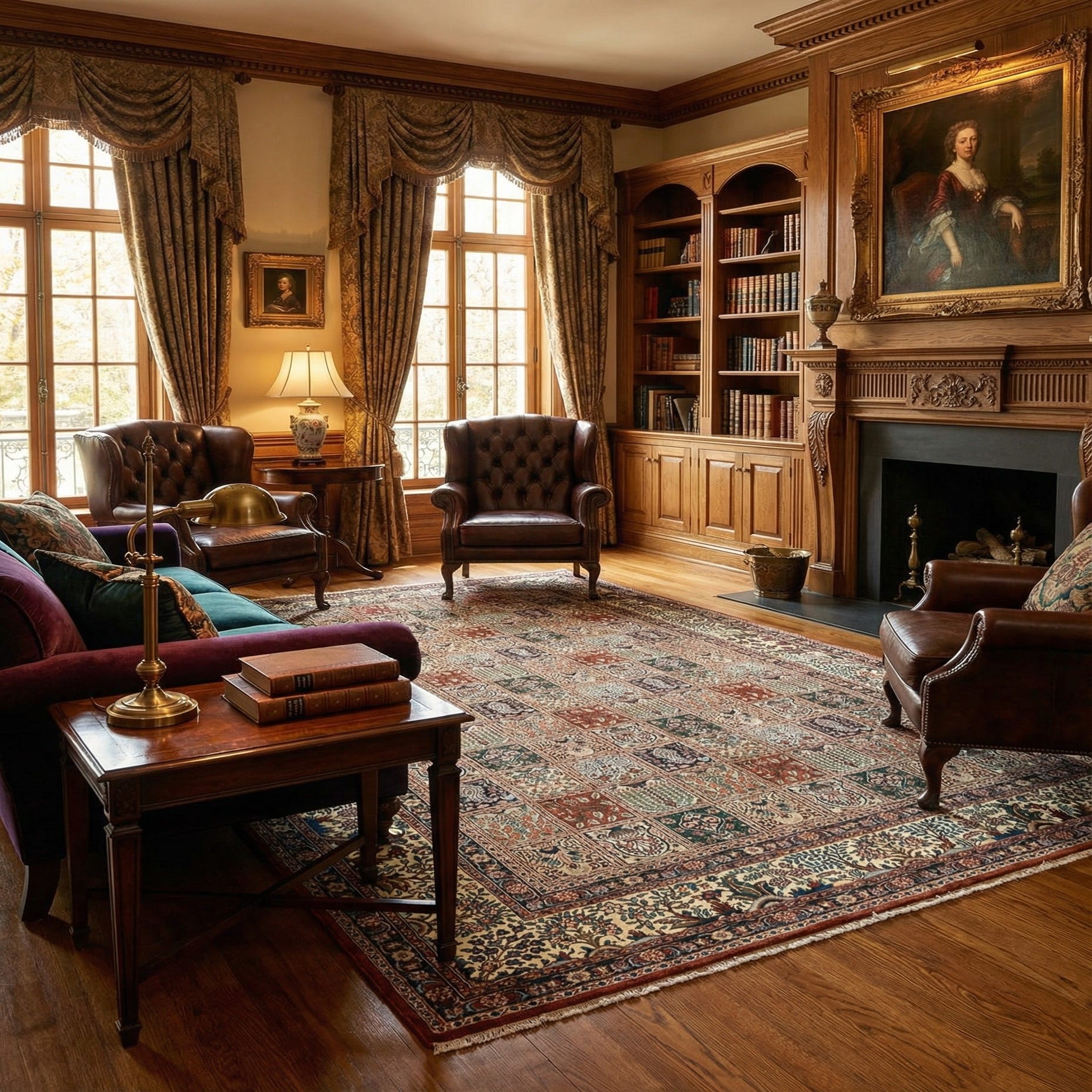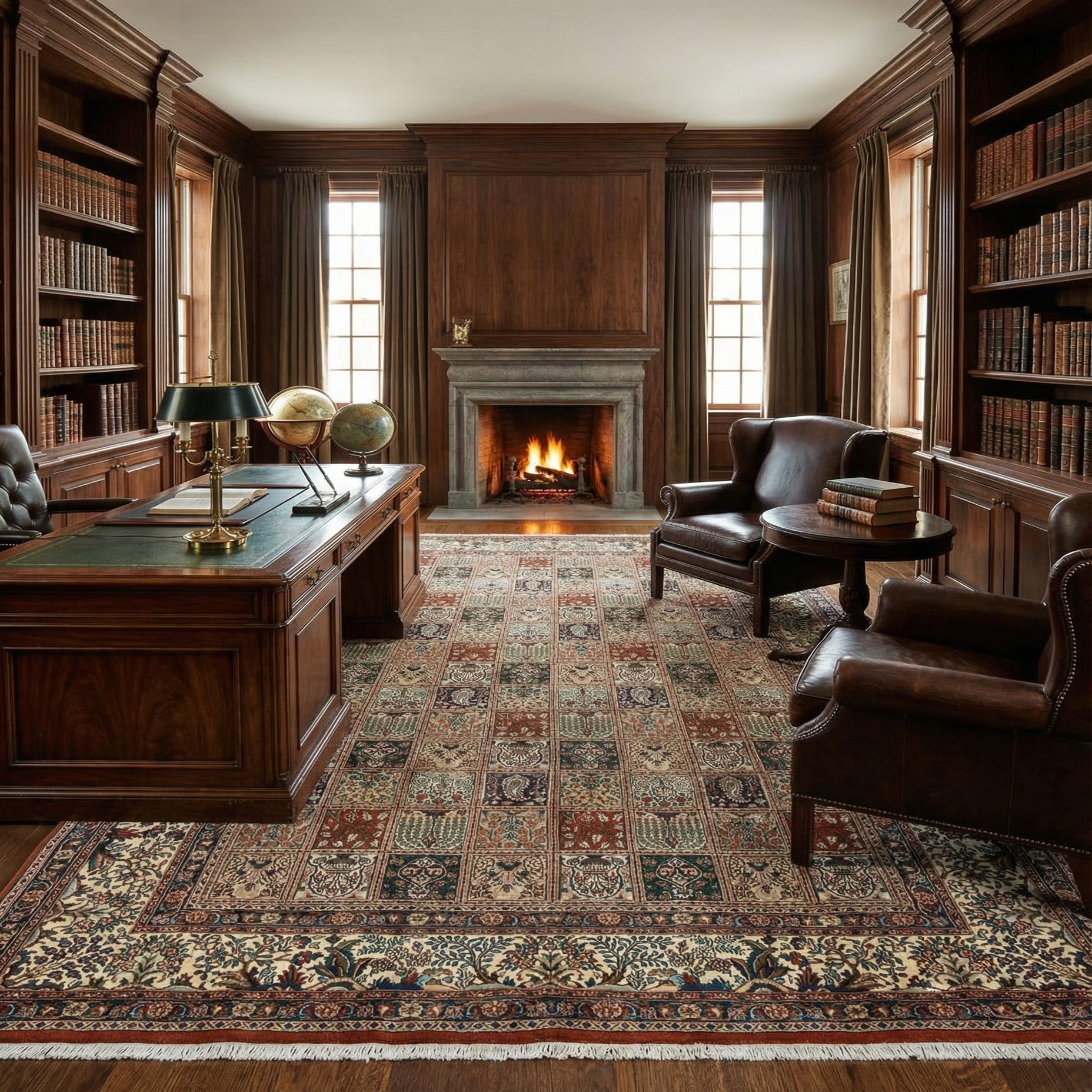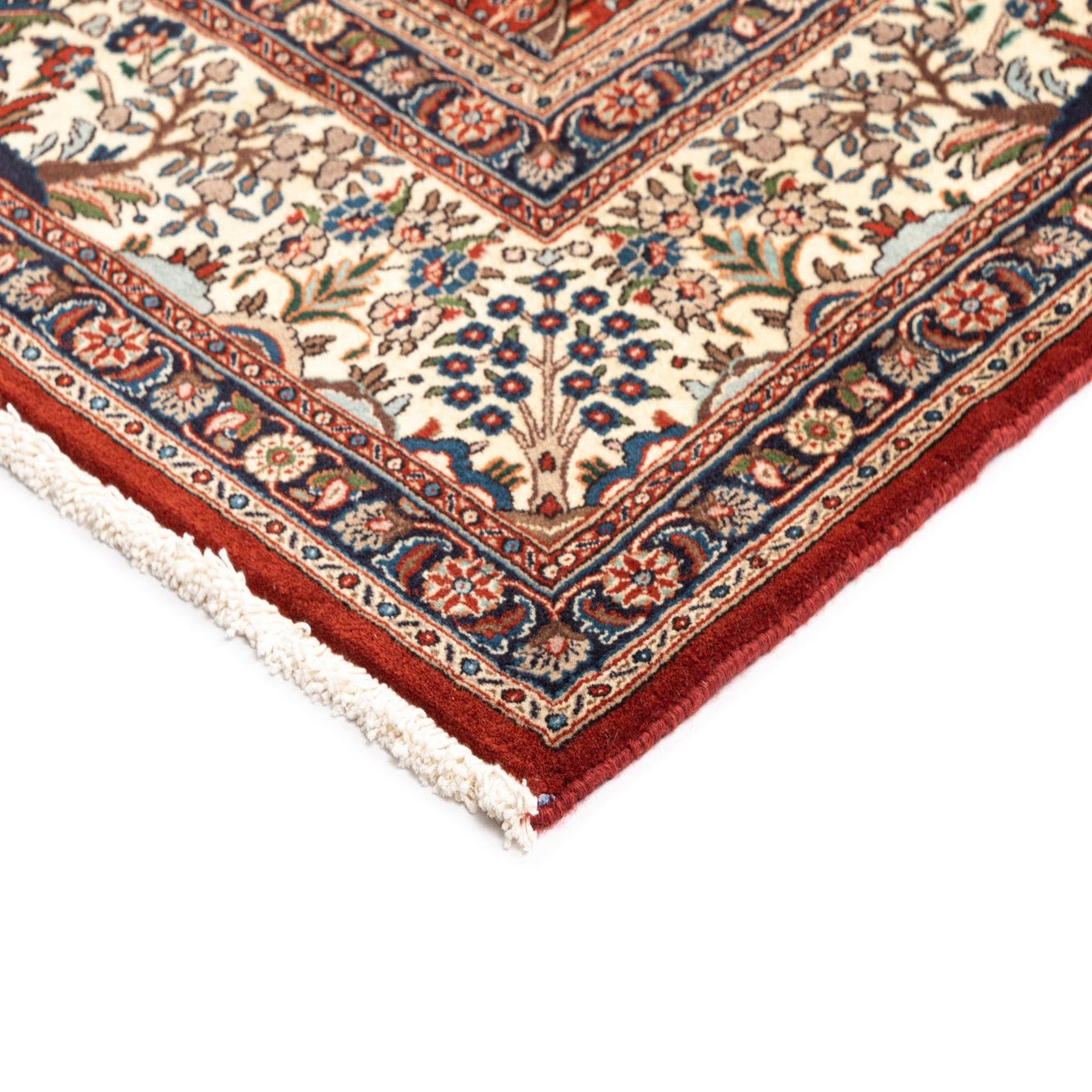 Hand made from 100% wool, the surface has a tactile density that feels soft underfoot and displays the pattern with crisp definition. The wool pile offers natural resilience and a subtle luster that highlights the detailed motifs when light moves across the rug. Place it to anchor a living room seating group or beneath a coffee table, layer it in a study or home office for a collected look, or use it to add color and pattern to a dining area—its traditional patterning pairs well with classic, transitional, or vintage-inspired contemporary furnishings.