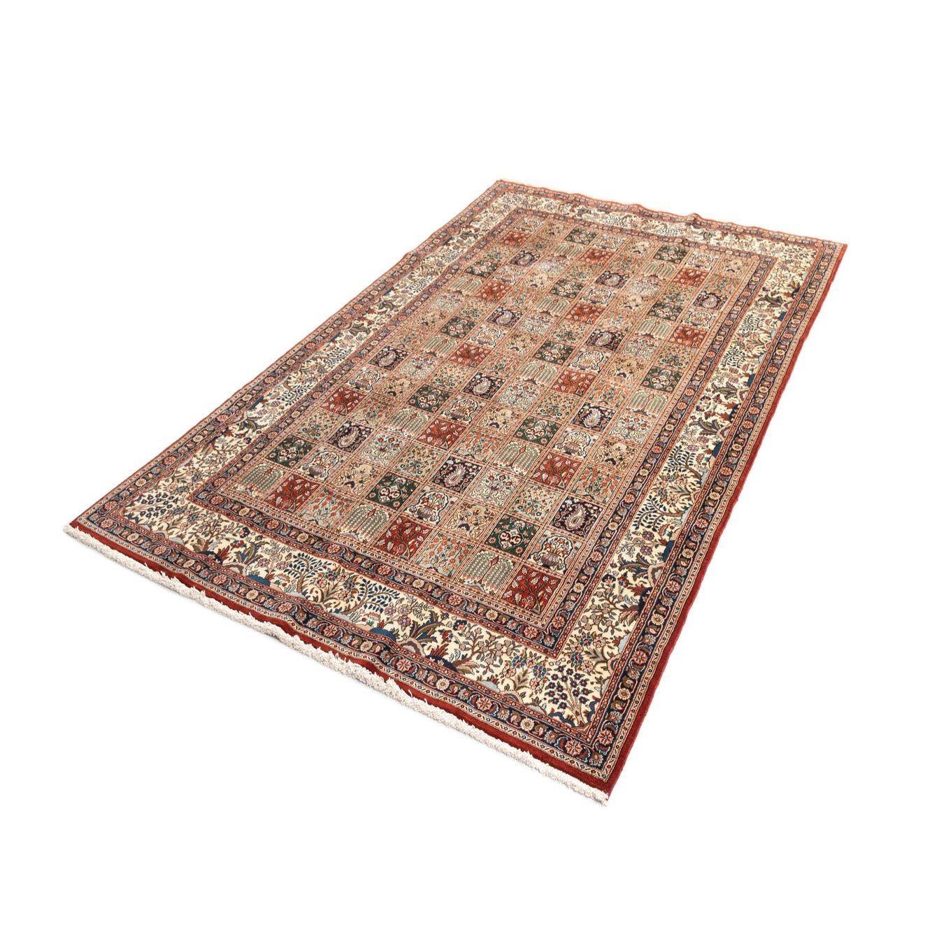A rich red field sets the stage for a finely detailed panel design made up of dozens of small, framed squares, each filled with its own floral or paisley motif, tiny vases and stylized trees. The repeating grid creates a disciplined, traditional look while the cream outer border with scrolling vines and rosettes lifts the composition and adds contrast. Color notes of beige, brown, dark blue, green and touches of blue and cream are woven into the motifs, giving the rug a layered, antique-inspired palette that reads as warm and grounded in a range of interiors.