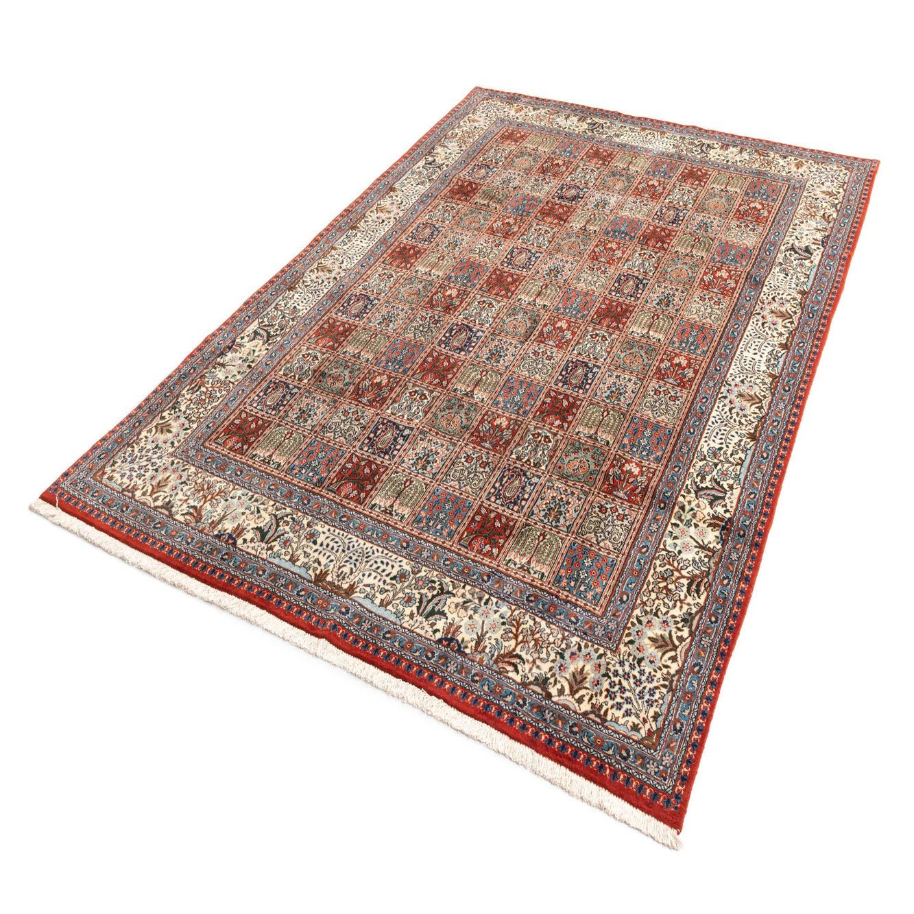 A 6x9 rectangular Persian rug featuring a grid of red, blue, and cream squares with intricate floral and paisley patterns, surrounded by a detailed border.