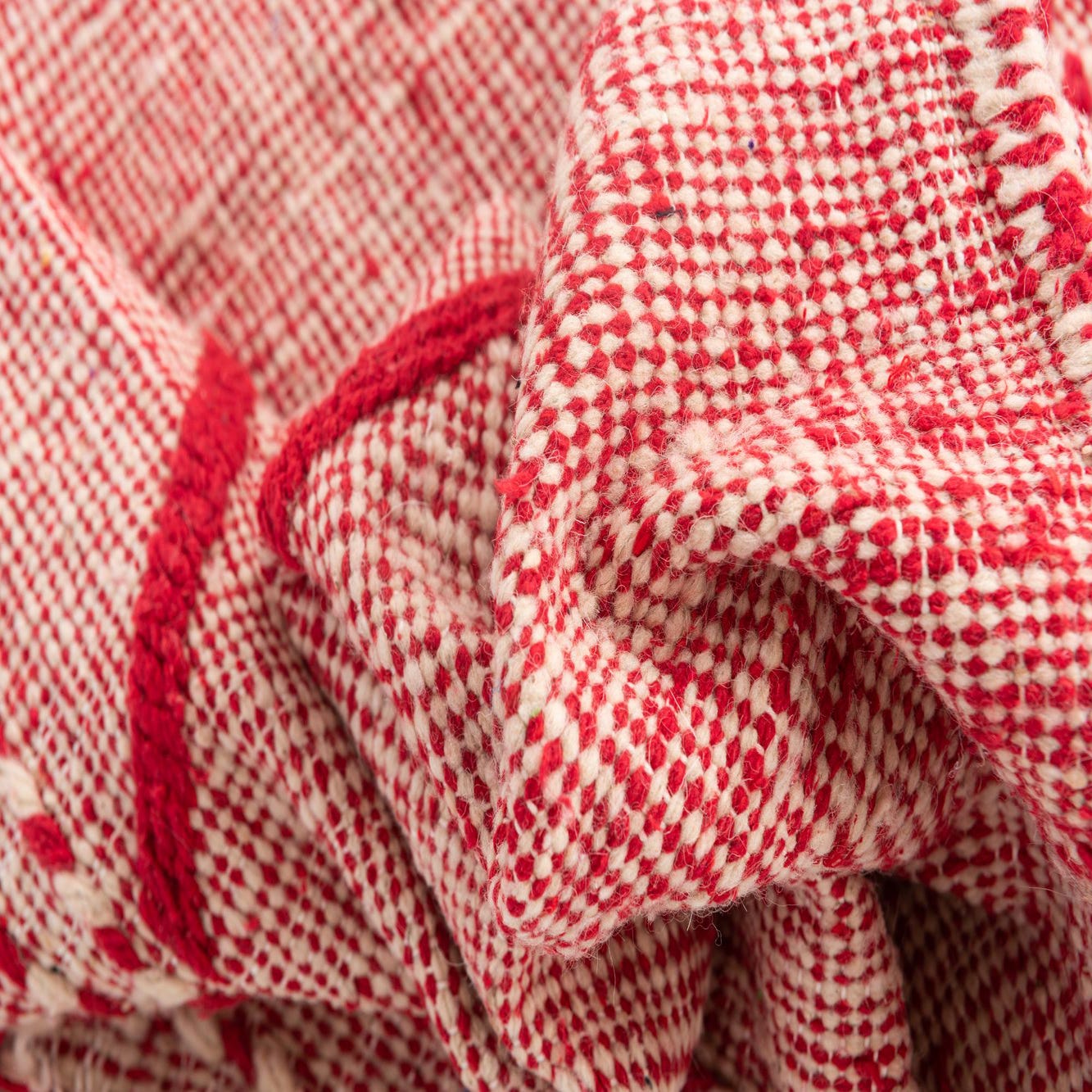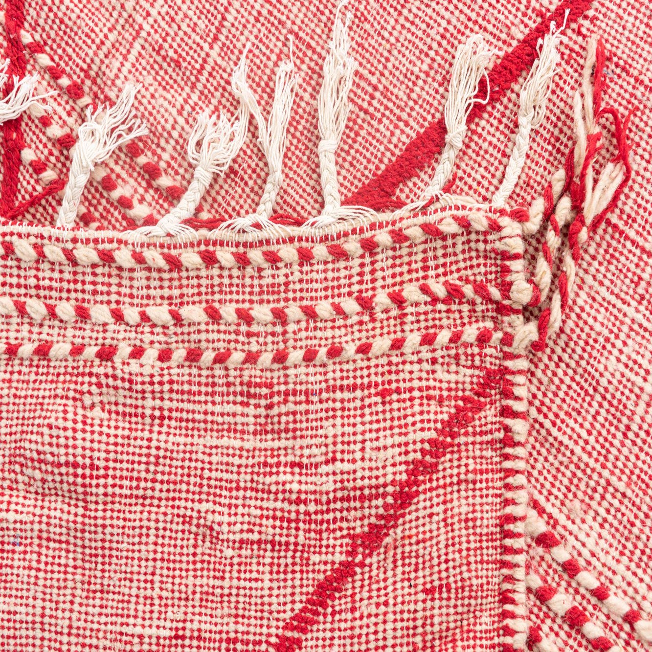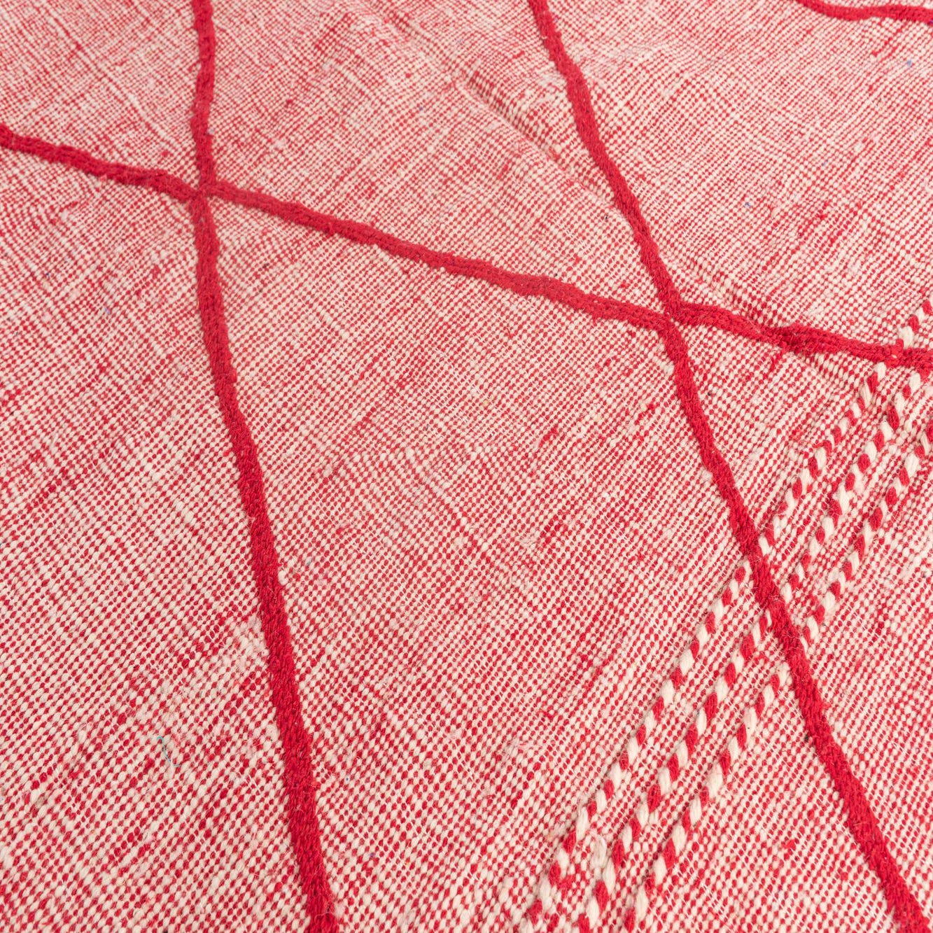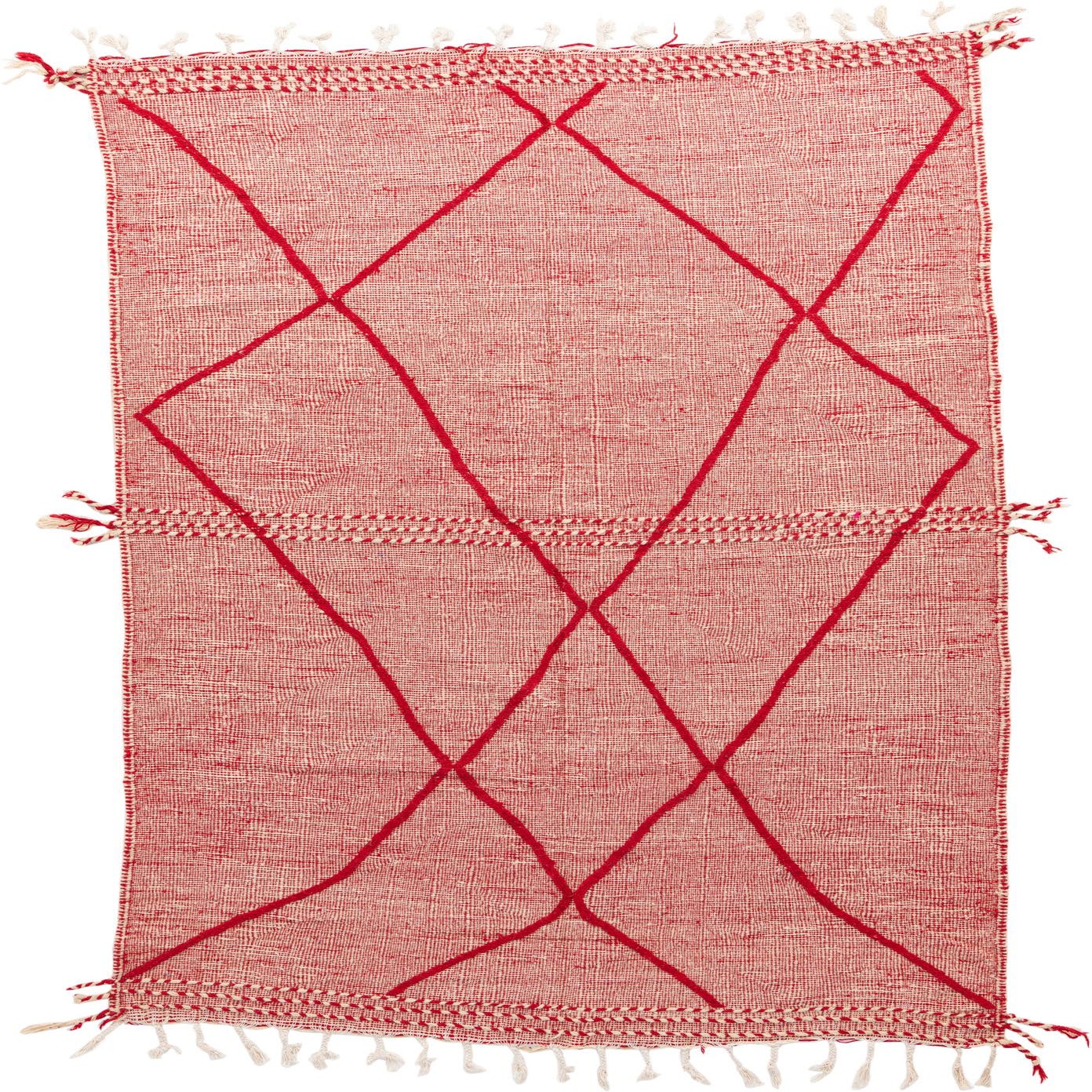 This hand-knotted Moroccan collection rug, sized 6x9 and crafted from 100% wool, presents a warm red background complemented by ivory accents. Its design features a diamond lattice pattern that lends a sense of geometric structure while remaining true to its tribal heritage. The texture of the piece showcases the artisanal handiwork, displaying a tactile surface that invites touch. The fringe on either end adds a traditional finish to the rug, encapsulating its authentic origins.