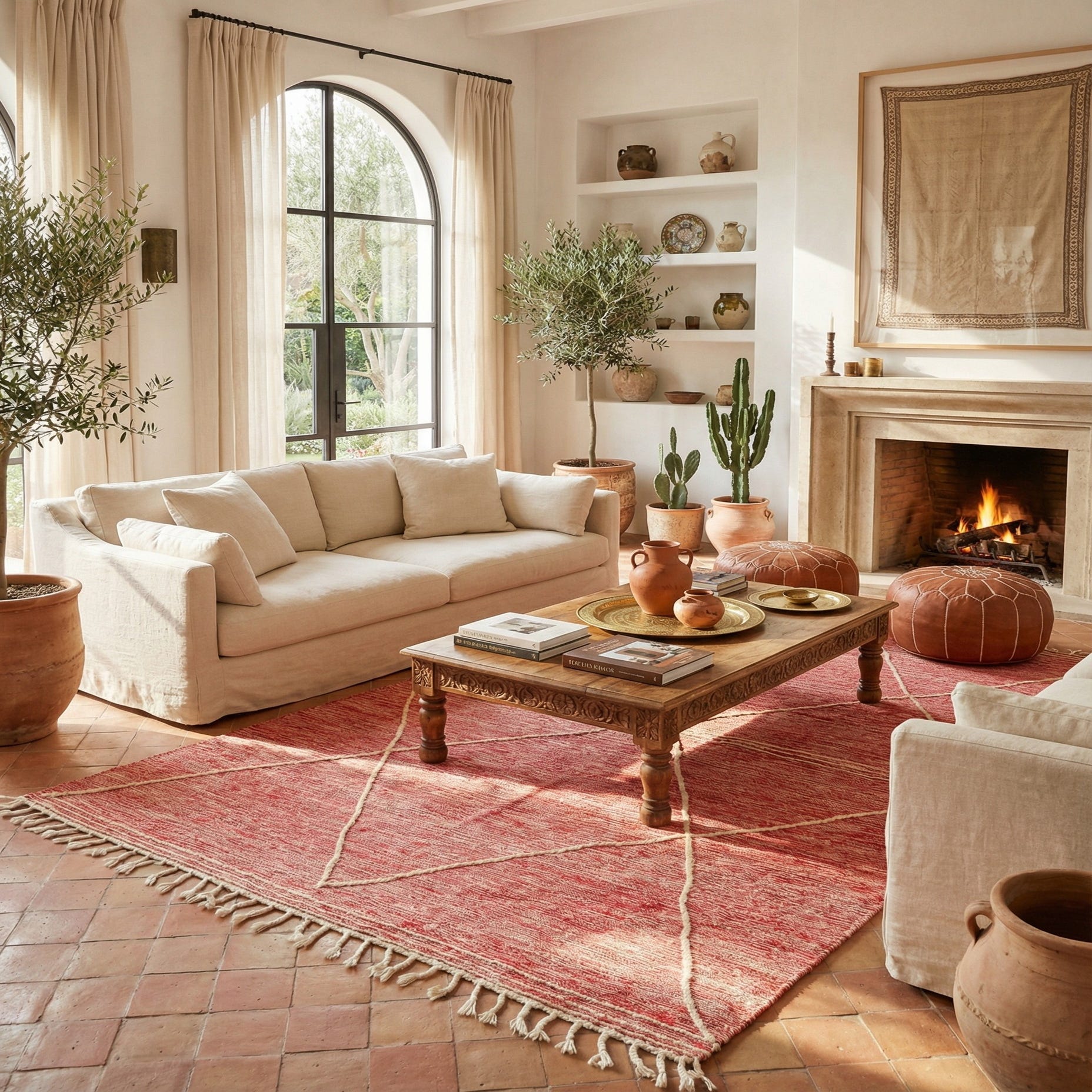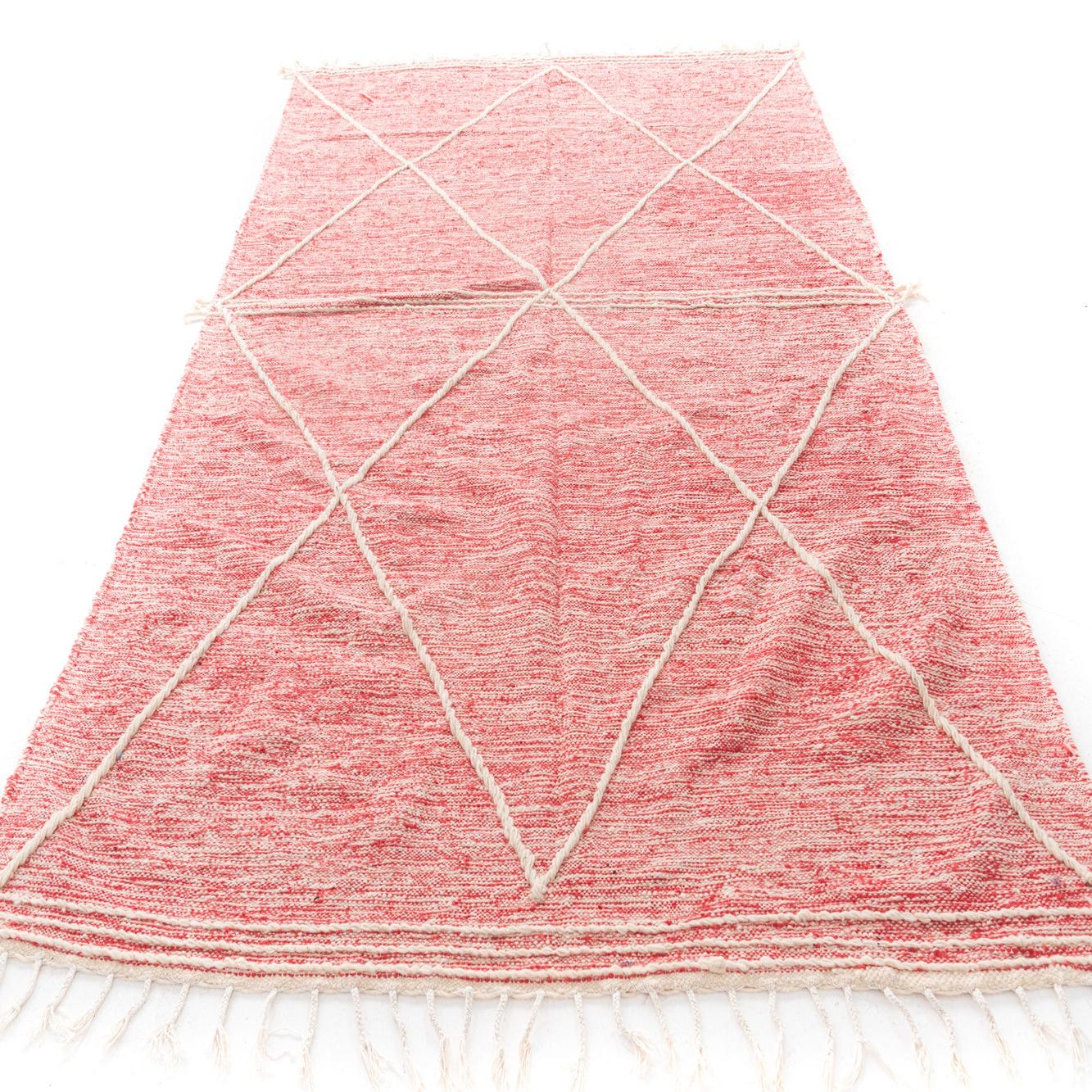 A 6x9 rectangular red wool shag rug with a cream diamond tribal pattern and fringe.