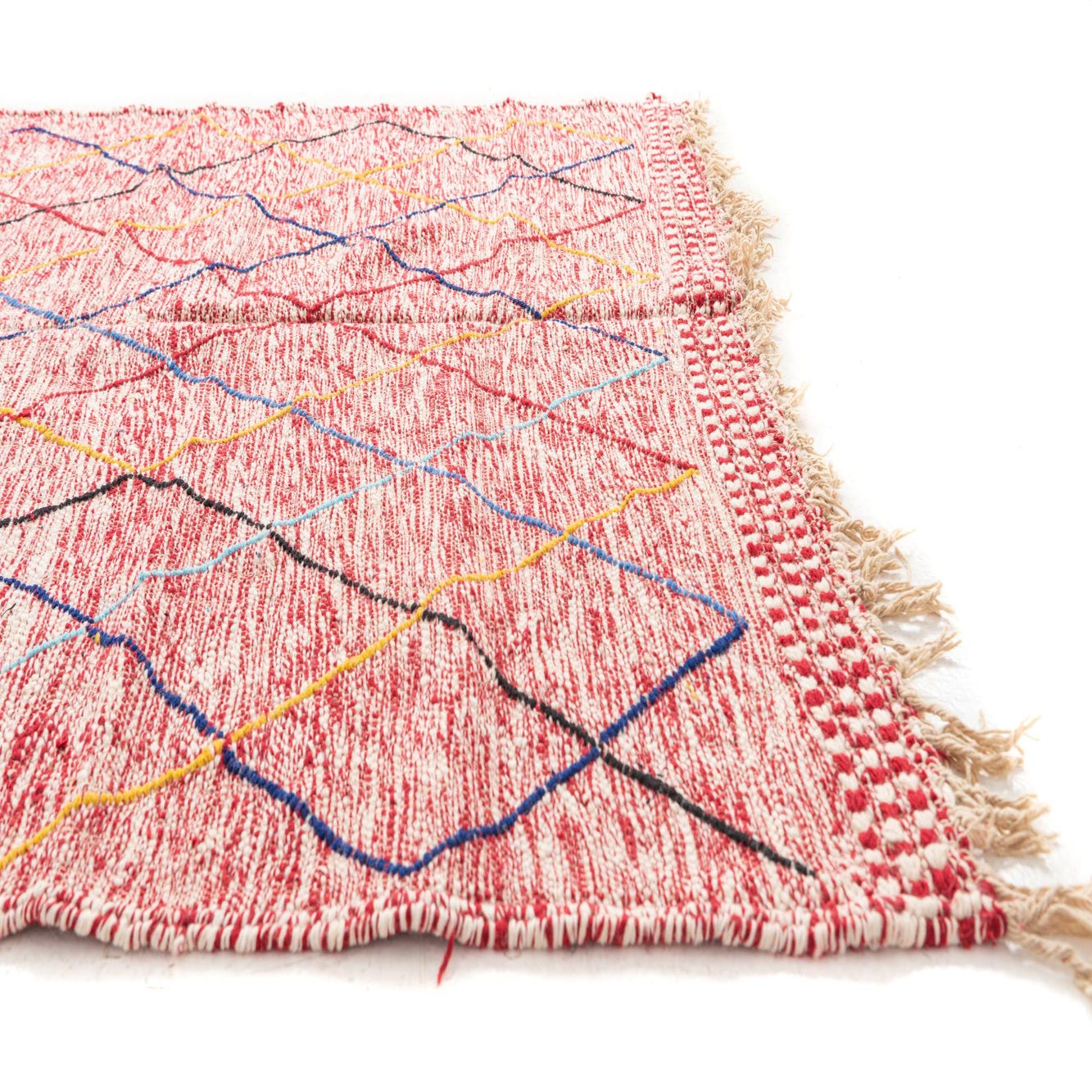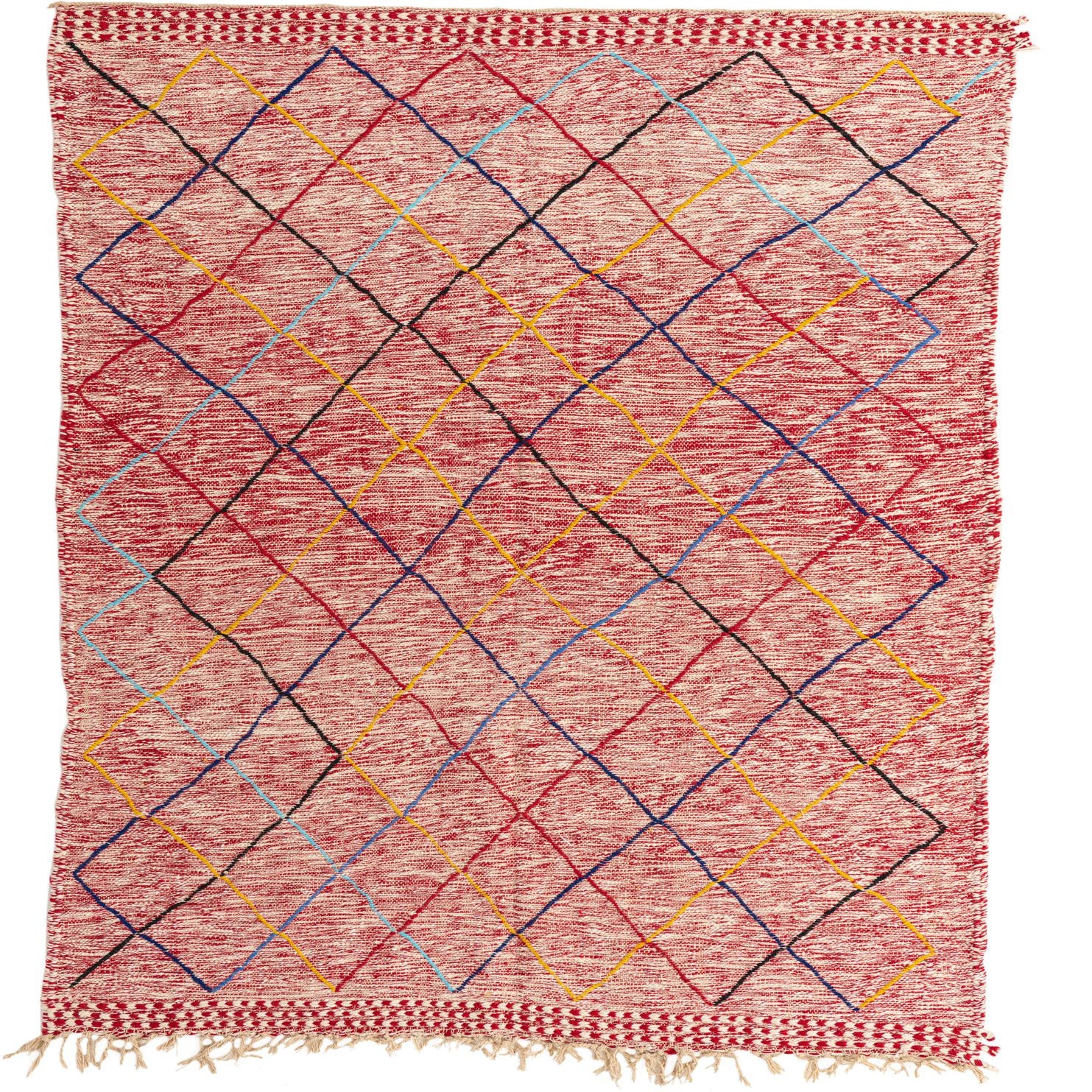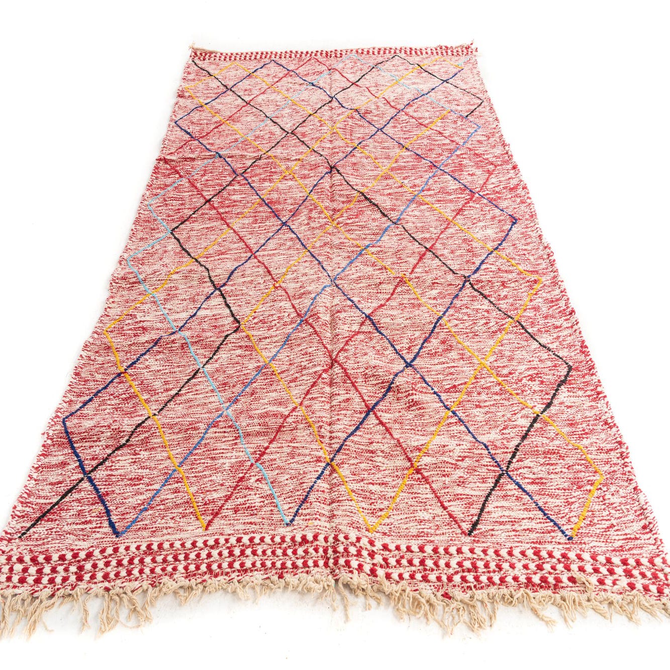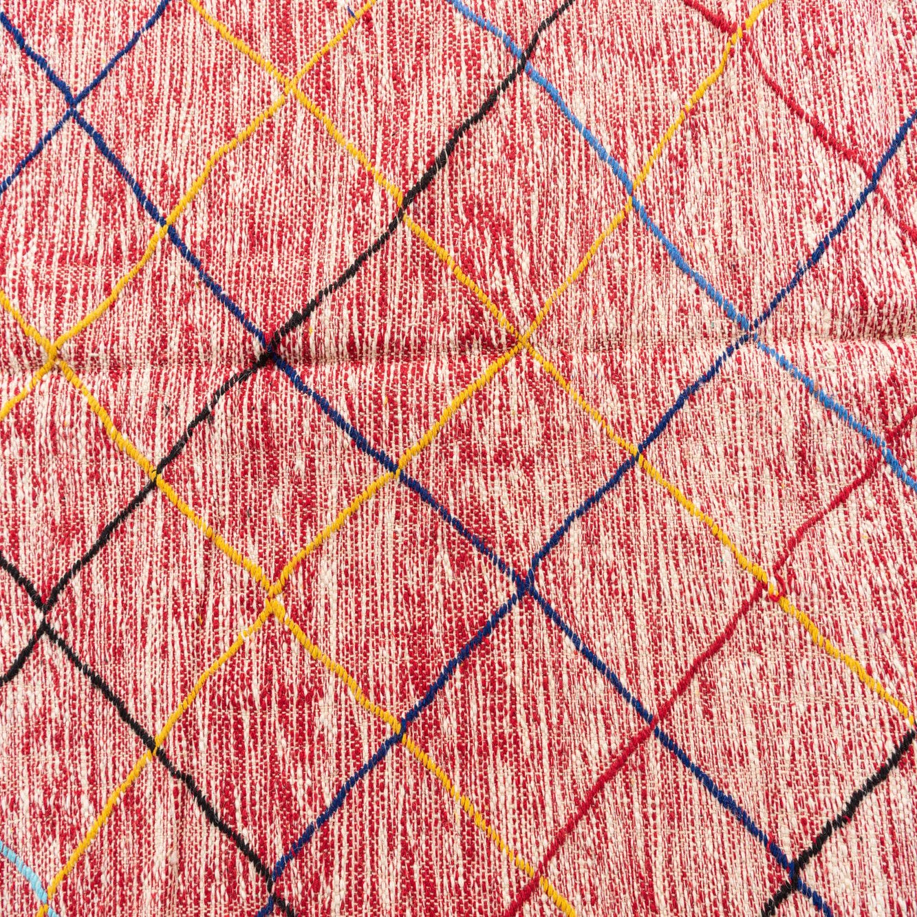 The featured Moroccan Hand Knotted rug, measuring 6x9, is crafted from 100% wool, presenting a durable and tactile surface. With a red background, this rug showcases a captivating pattern of diagonal lines and diamonds in black, blue, yellow, and light blue hues that impart a dynamic and vibrant aesthetic. The visual interest is further enhanced by the texture of the weave that adds depth to the design.