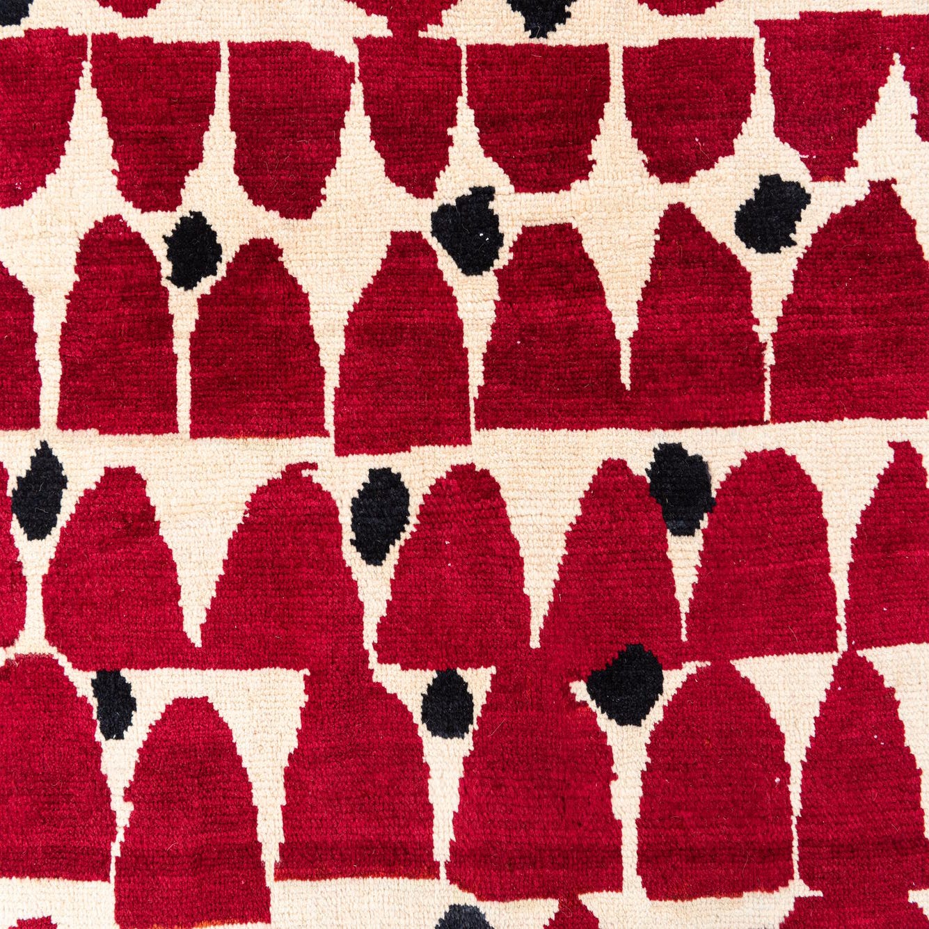 A 6x9 rectangular red and cream wool shag rug with a modern tribal pattern of large red ovals and smaller red and black shapes on a cream background.