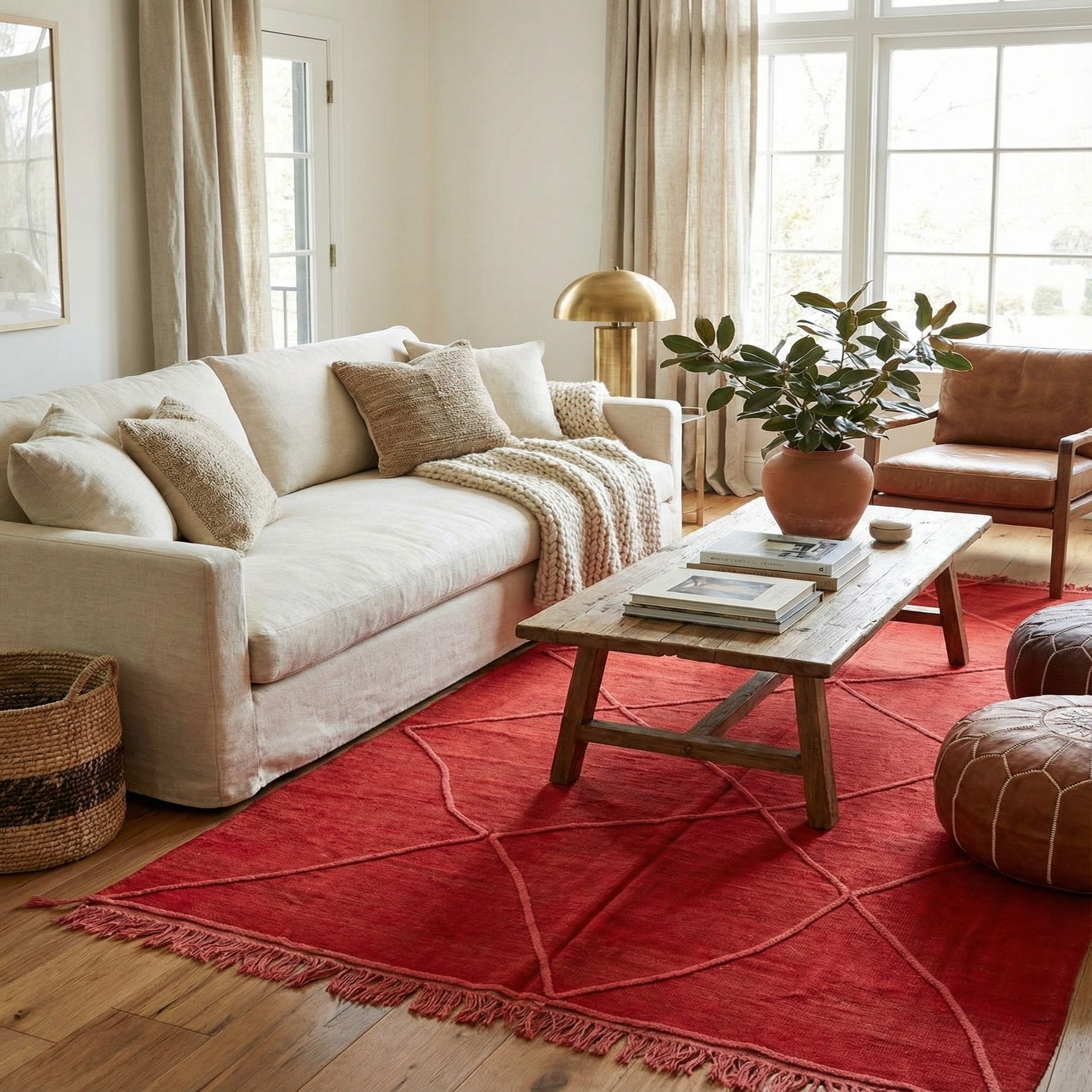A 6x9 rectangular red wool shag rug with a subtle tribal diamond pattern made from raised, lighter red lines, featuring fringe.