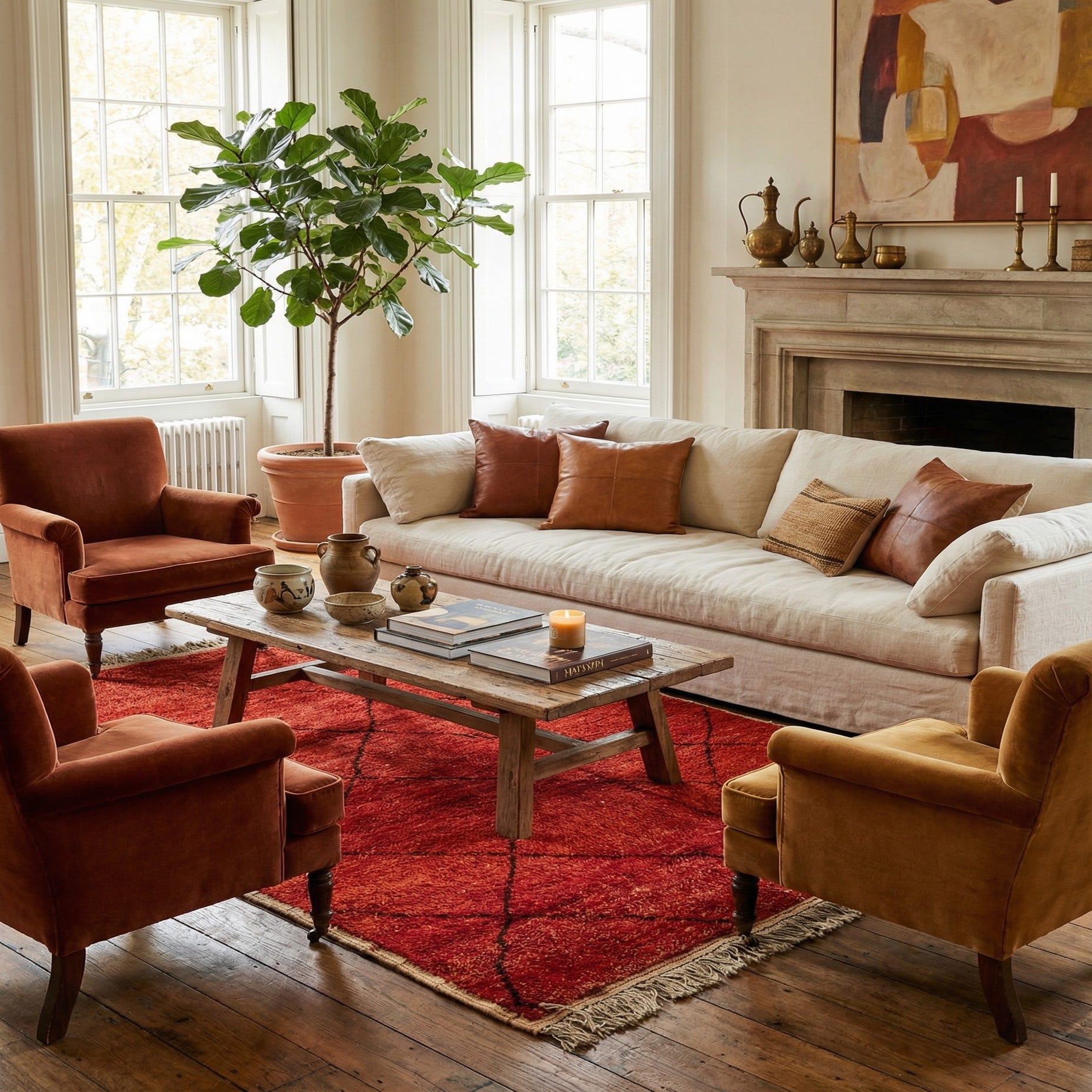 A 6x9 rectangular red shag rug with a black diamond tribal pattern and fringed ends, suitable for a living room.