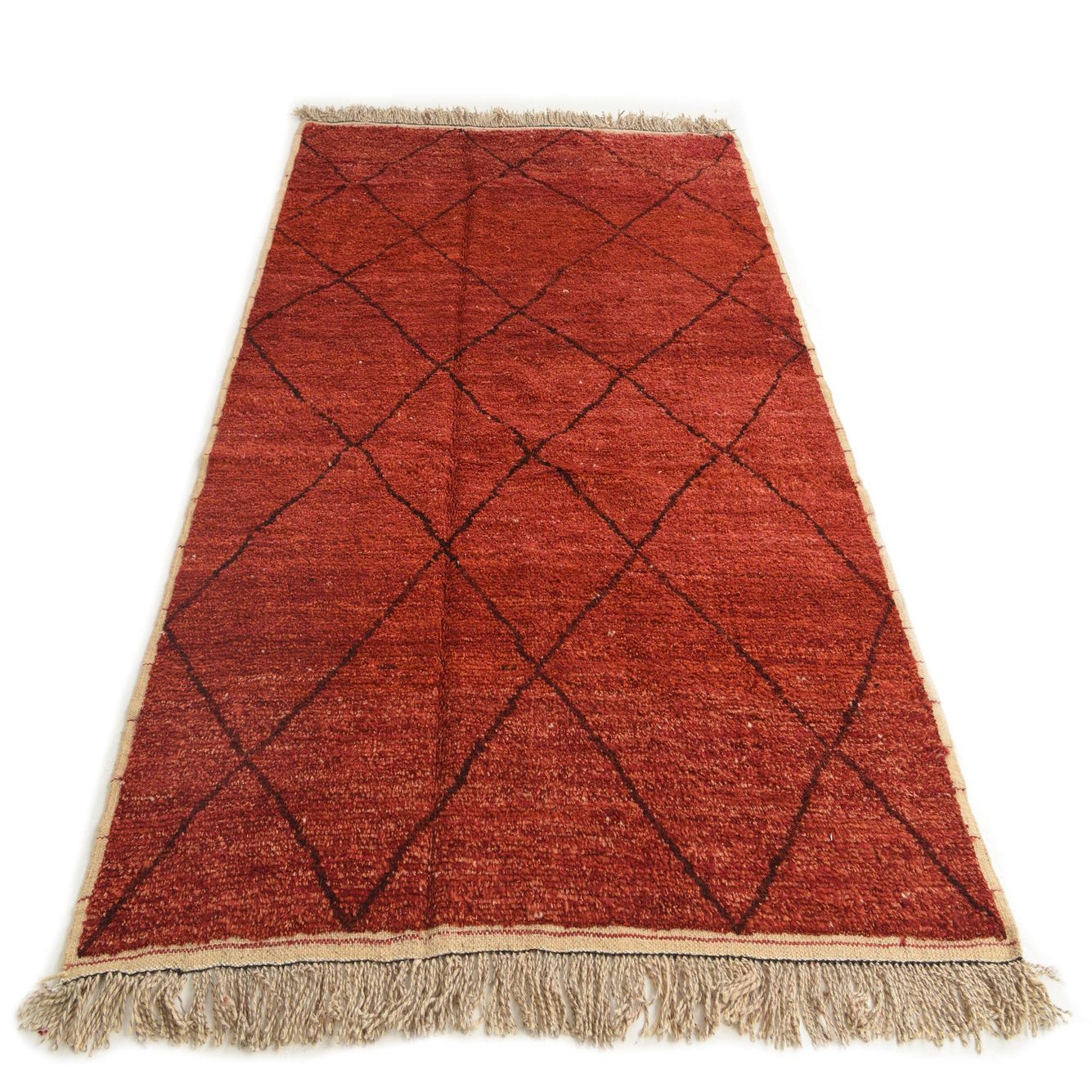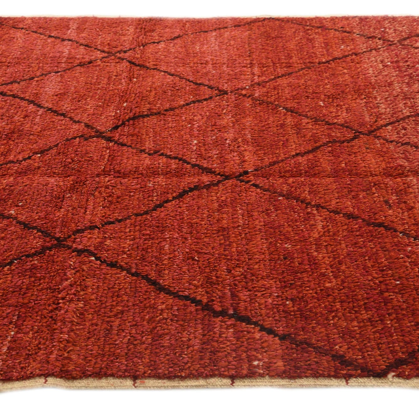 This Moroccan collection rug features a deep red background with a pattern of black and orange linear diamond motifs, providing a striking contrast and bold graphic appeal. Its 6x9 dimensions make it a versatile size for a variety of rooms. Hand-knotted from 100% wool, this rug offers a rich texture that enhances its visual depth while also ensuring durability and a soft underfoot feel.