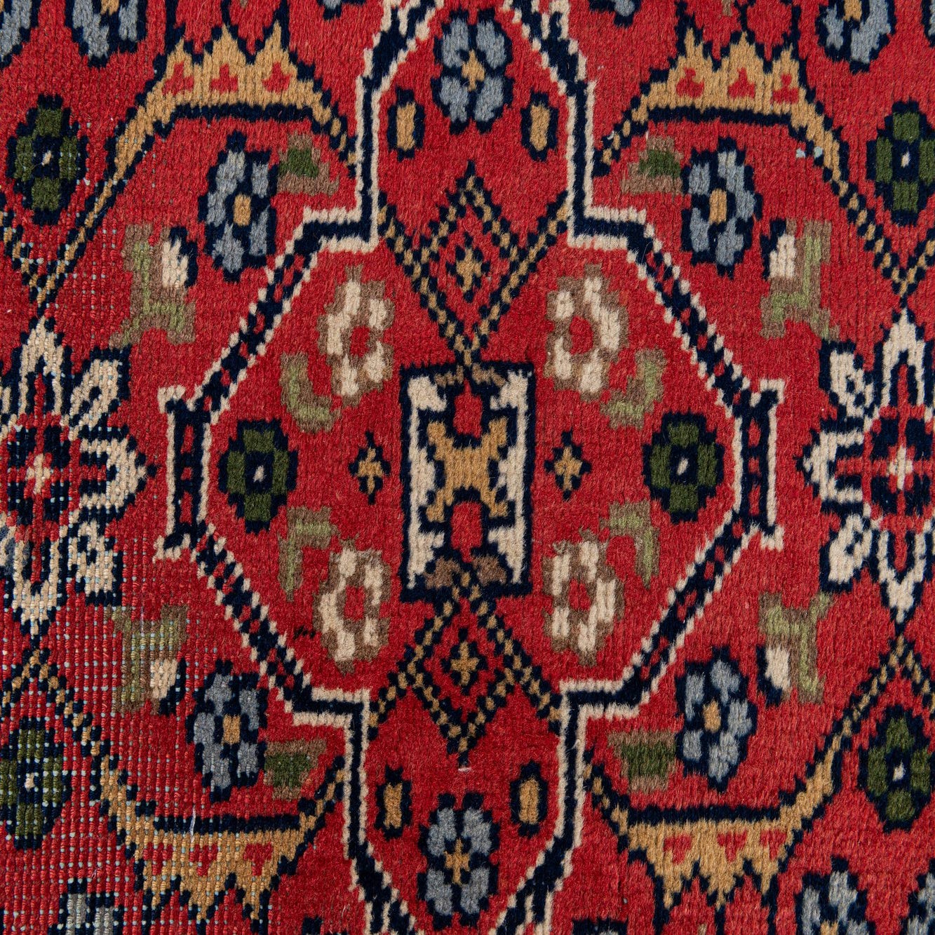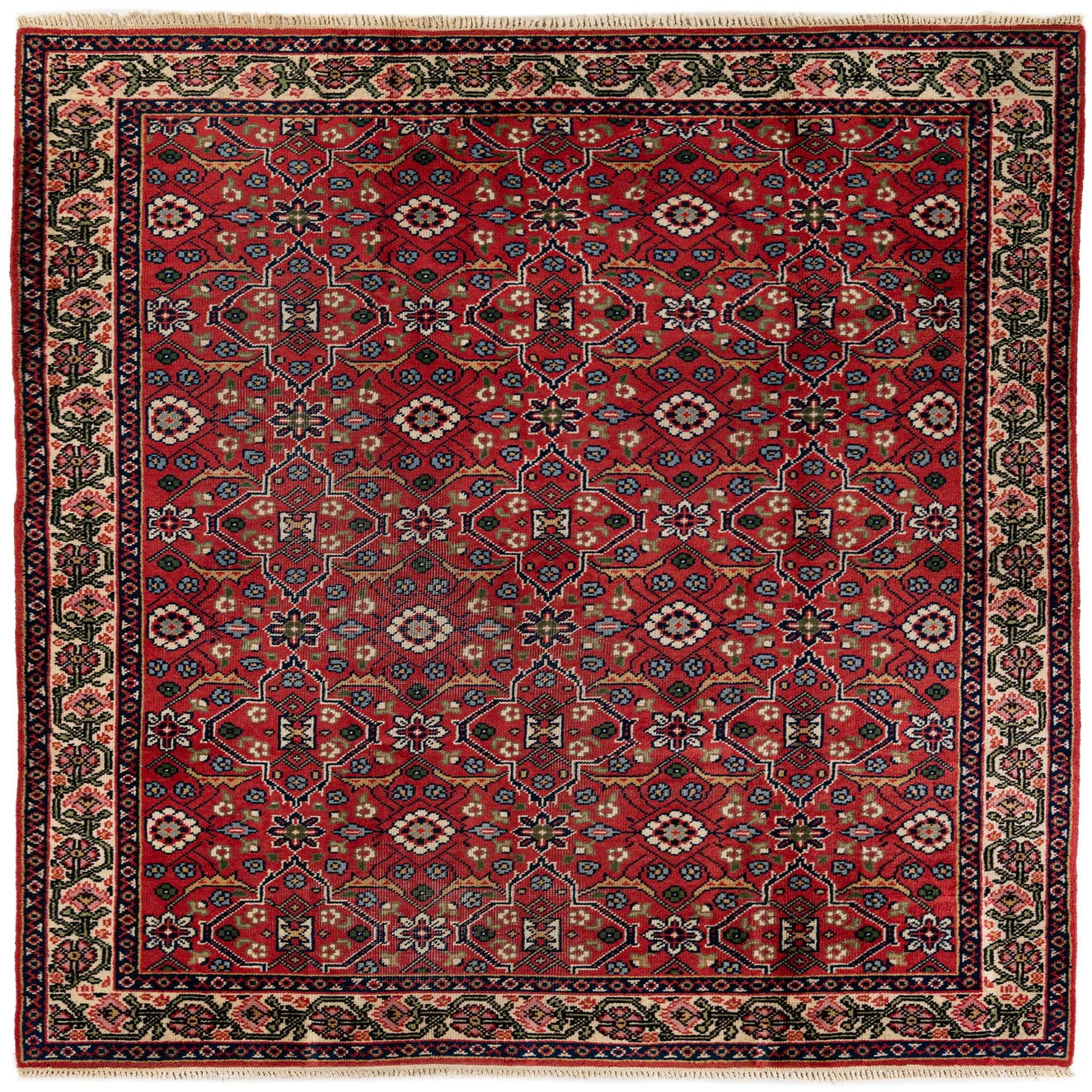 A 6x9 rectangular red wool rug with a traditional floral and tribal pattern, featuring a detailed border.