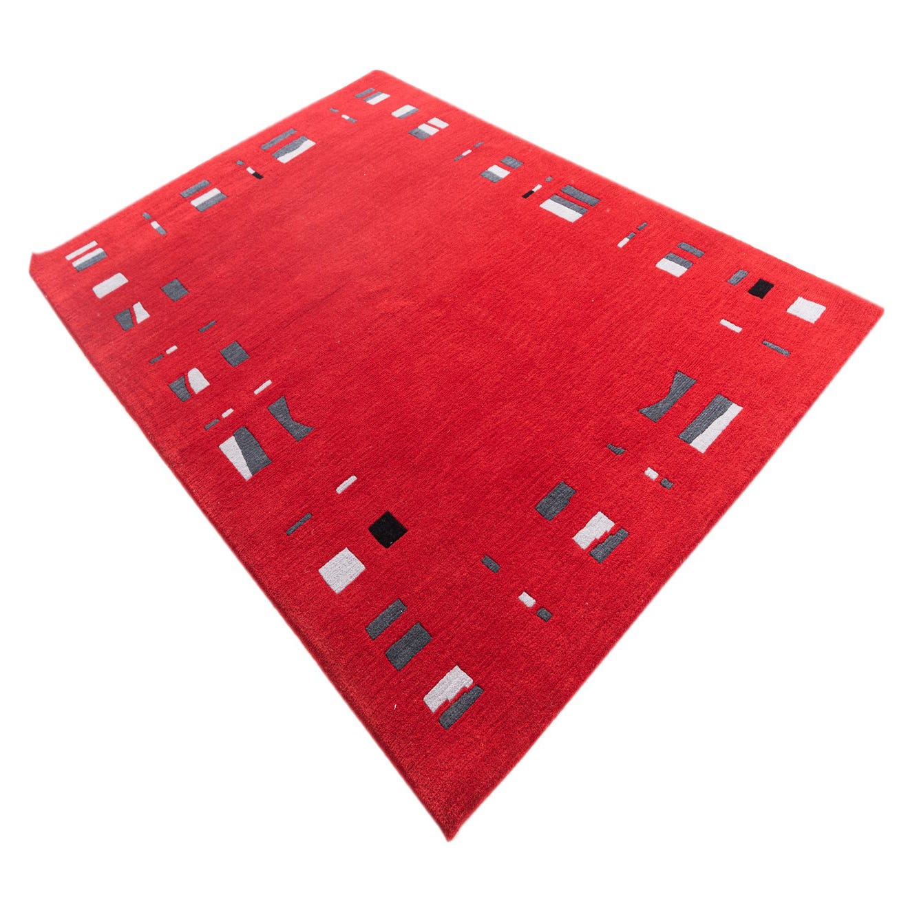 A 6x9 rectangular red wool rug with a modern abstract border pattern in grey, light grey, and black.