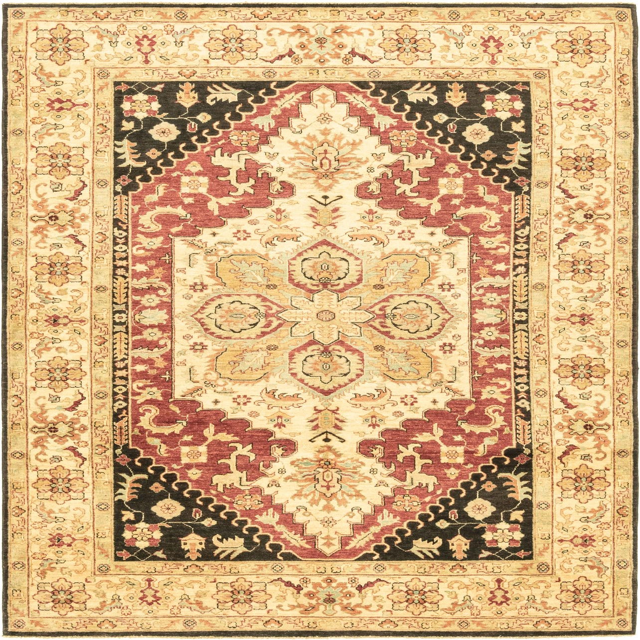 A 6x9 rectangular Peshawar Ziegler rug with a central medallion, featuring reds, black, and cream botanical and tribal patterns, perfect for a living room.
