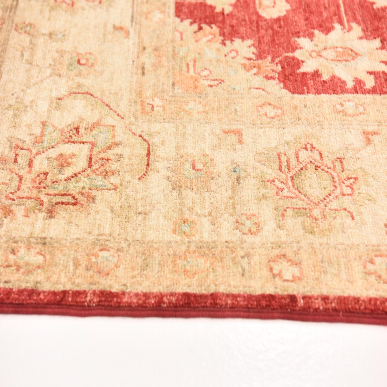 This rug is characterized by a border that elegantly frames the central layout, subtly incorporating lighter hues which complement the dominant red. The balanced use of color and design in the Peshawar Ziegler rug ensures that it can serve as both a focal point and a harmonious addition to a variety of interior spaces. Given its warm palette and classic design, it is well-suited for rooms that aim to evoke a sense of history and warmth, such as living rooms with rich wooden furnishings, regal dining spaces, or refined office settings. The rug's woolen texture provides a natural, grounding element to any room it inhabits.