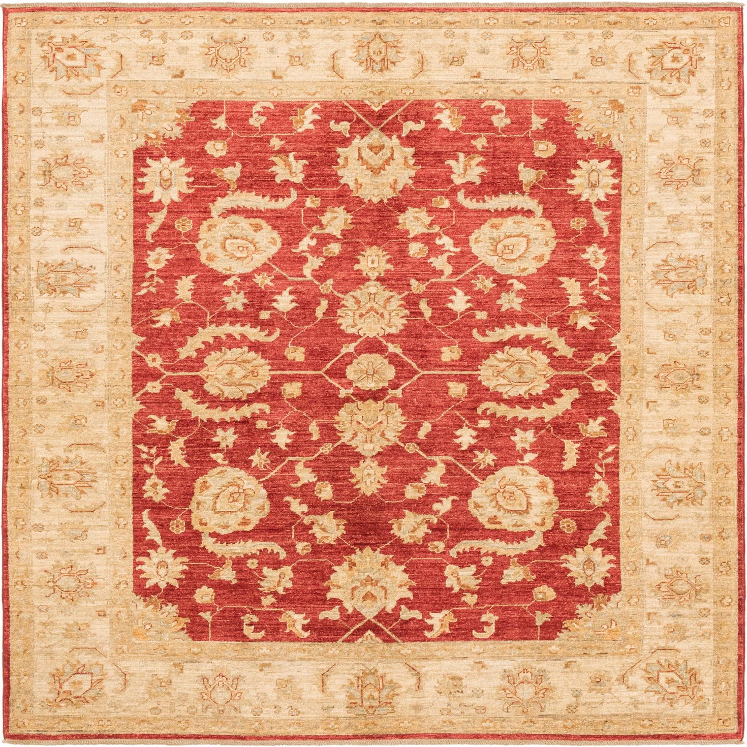 The Peshawar Ziegler rug, hand-knotted from 100% hand-spun wool, presents a rich tapestry of heritage and craftsmanship. This 6x9 piece features a deep red background that serves as a striking canvas for the ornate pattern work in colors such as beige, cream, gold, light green, olive, and tan. The traditional motifs and floral elements are artfully arranged, creating a sophisticated symmetry across the surface, while the delicate variations in the hand-spun wool lend it a unique texture.