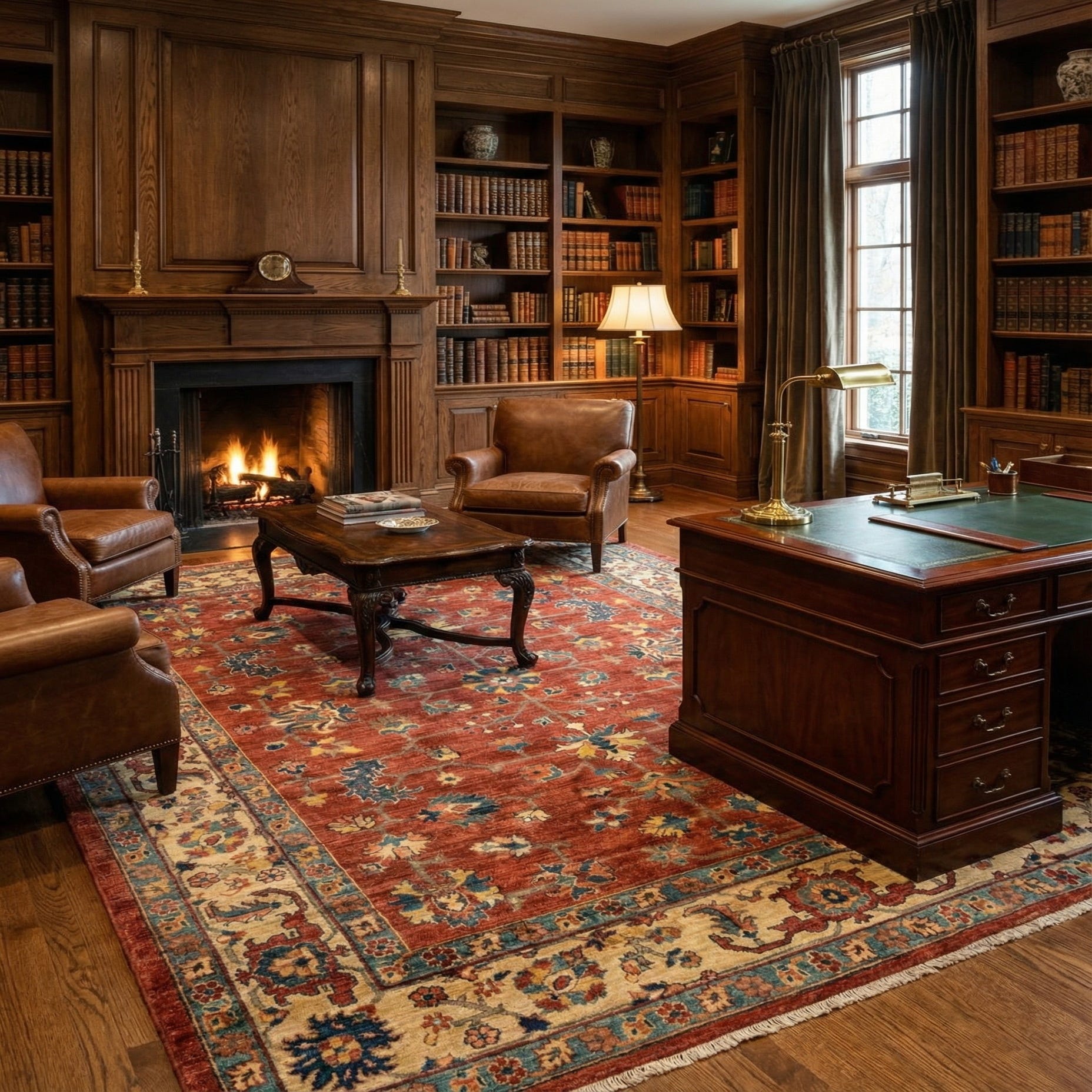 A 6x9 rectangular Persian rug in deep reds with intricate floral and medallion patterns in blue, gold, and cream.