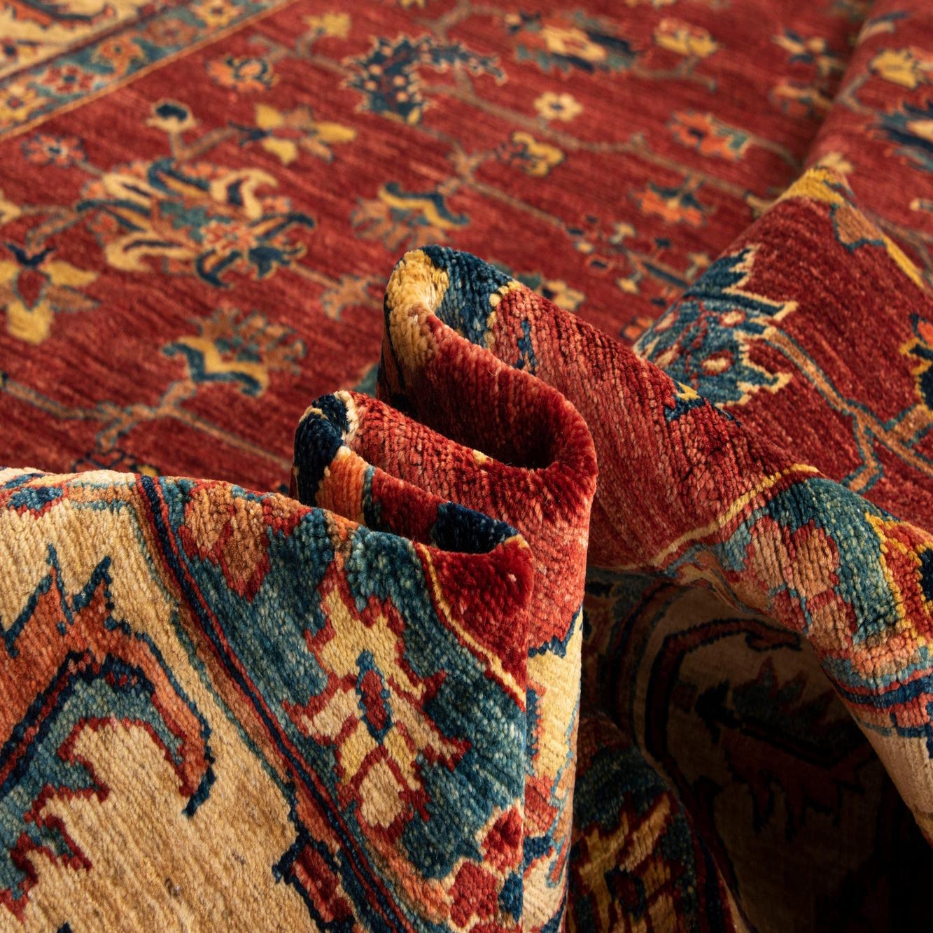 Primary color is Red. Colors in this rug include: Red, Red, Blue, Beige, Green, Brown.