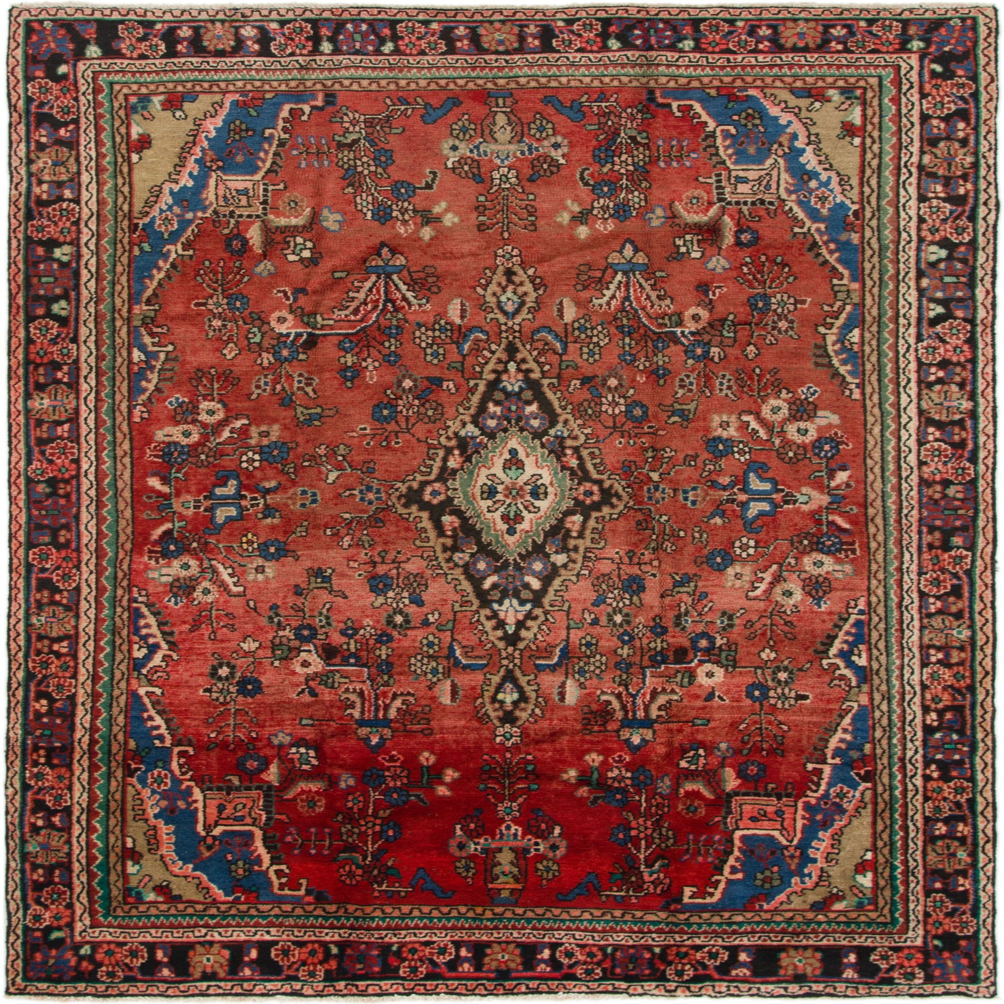 Primary color is Red. Colors in this rug include: Red, Beige, Black, Blue, Brown, Green, Ivory, Navy Blue, Pink.