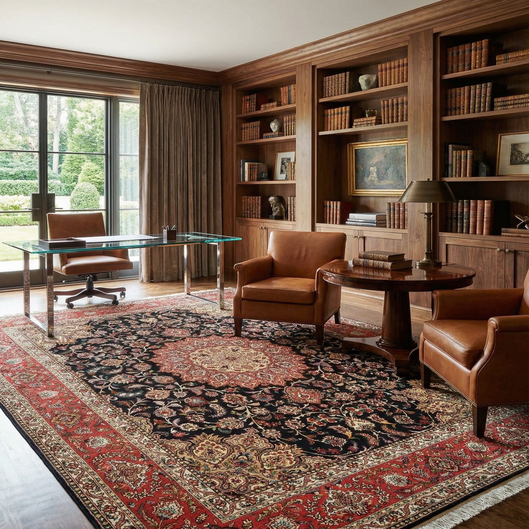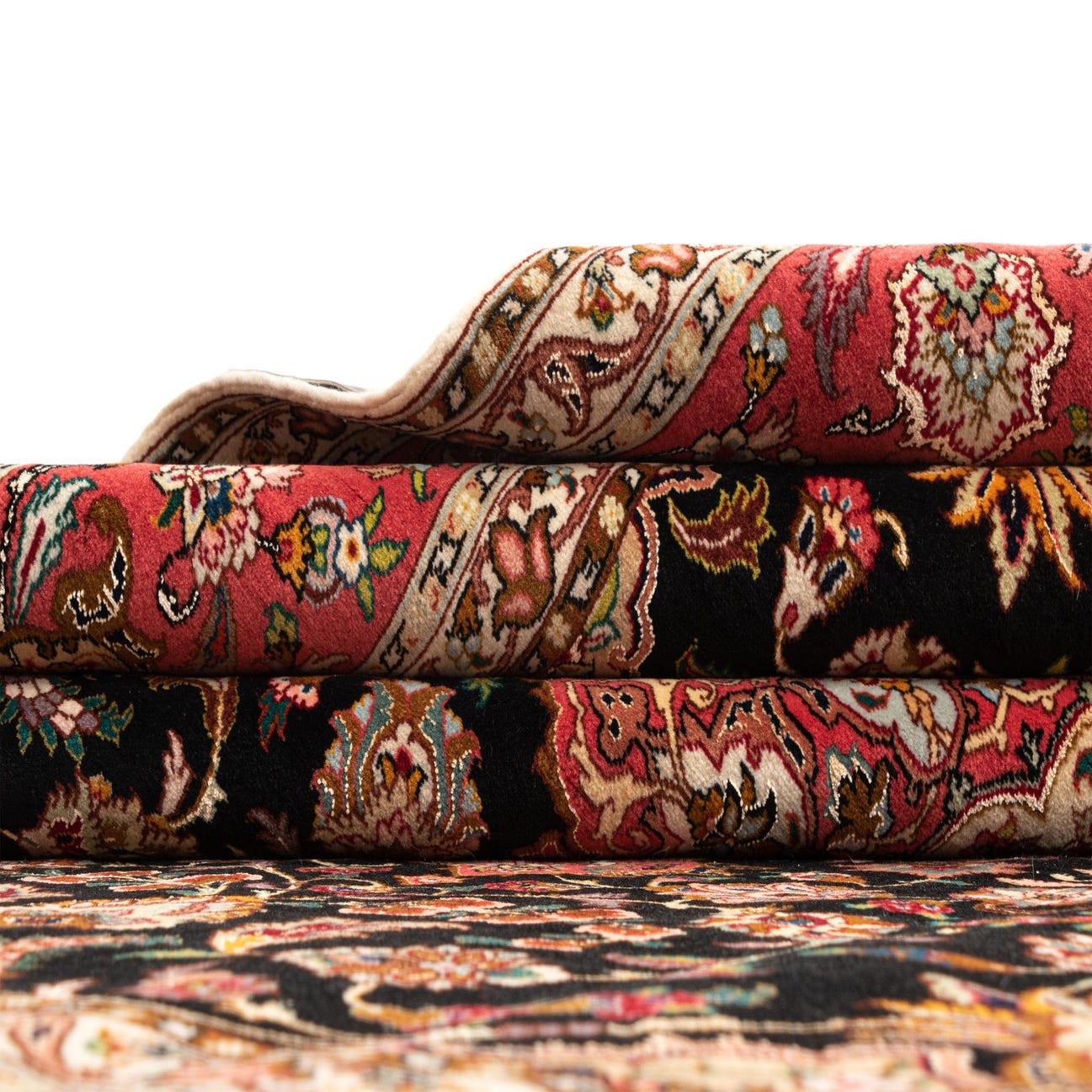 A luxurious 6x9 rectangular Persian Tabriz rug with a black field, red border, and intricate floral medallion.