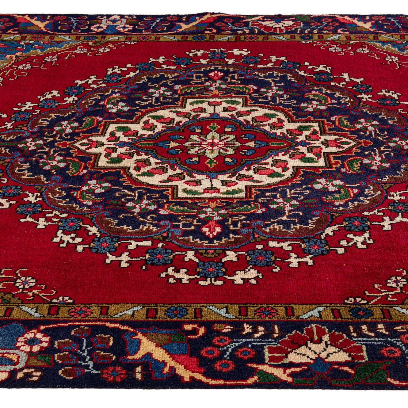 A 6x9 rectangular red Persian Tabriz rug with a detailed navy and cream medallion pattern, ideal for a living room.