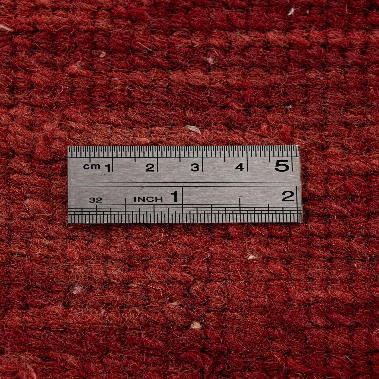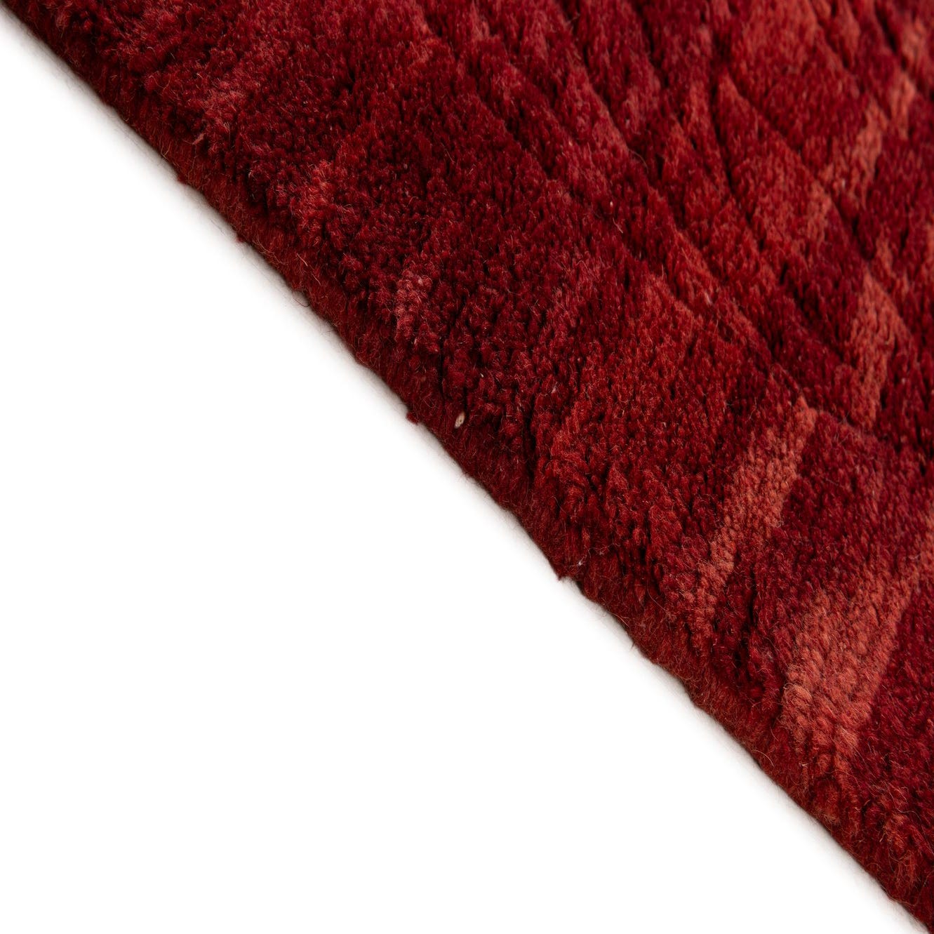 A 6x9 rectangular red wool area rug with subtle Oriental and abstract patterns, featuring light fringe.