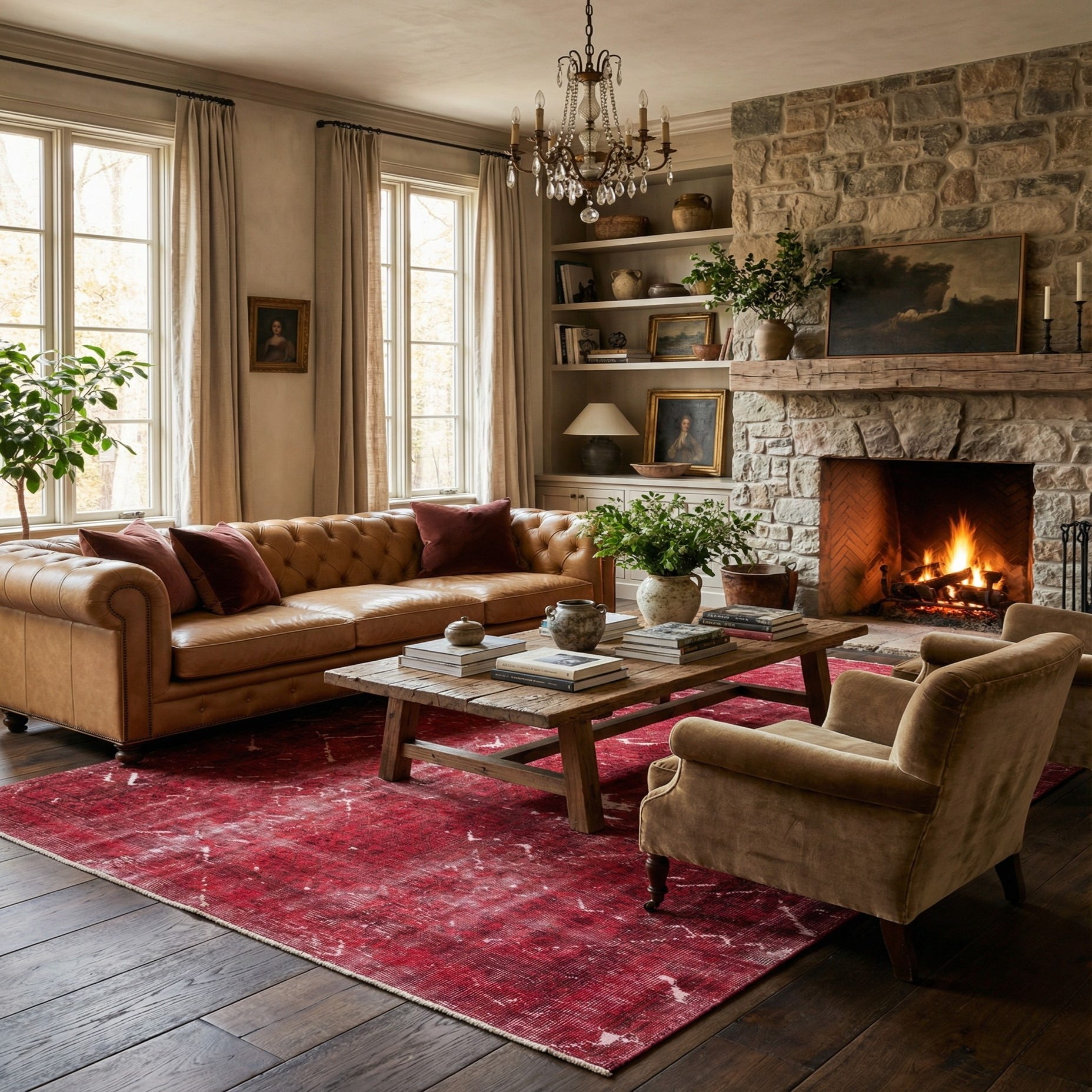 The color palette and design make this rug suitable for a range of interior designs from traditional to contemporary. It could act as a focal point in a minimalist setting or complement the warmth in a bohemian or industrial space. With its vibrant reds and warm undertones, it would be especially well-suited to environments with neutral or earthy color schemes, where it can add a pop of color and visual interest. This rug would serve well in a living room, dining area, or any space that seeks to combine comfort with an elegant vintage charm.