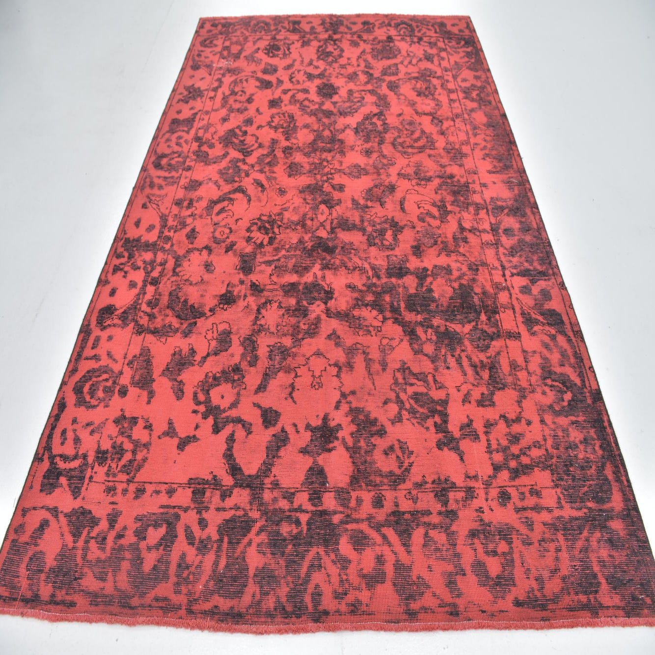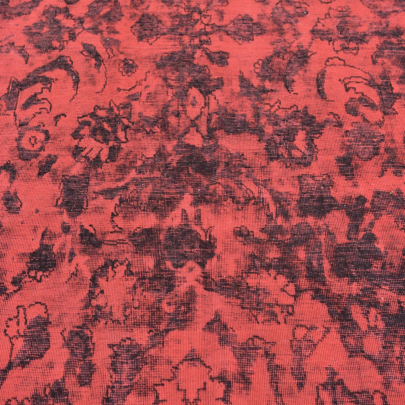 A 6x9 rectangular red wool rug with a distressed black Persian floral pattern and a subtle border.